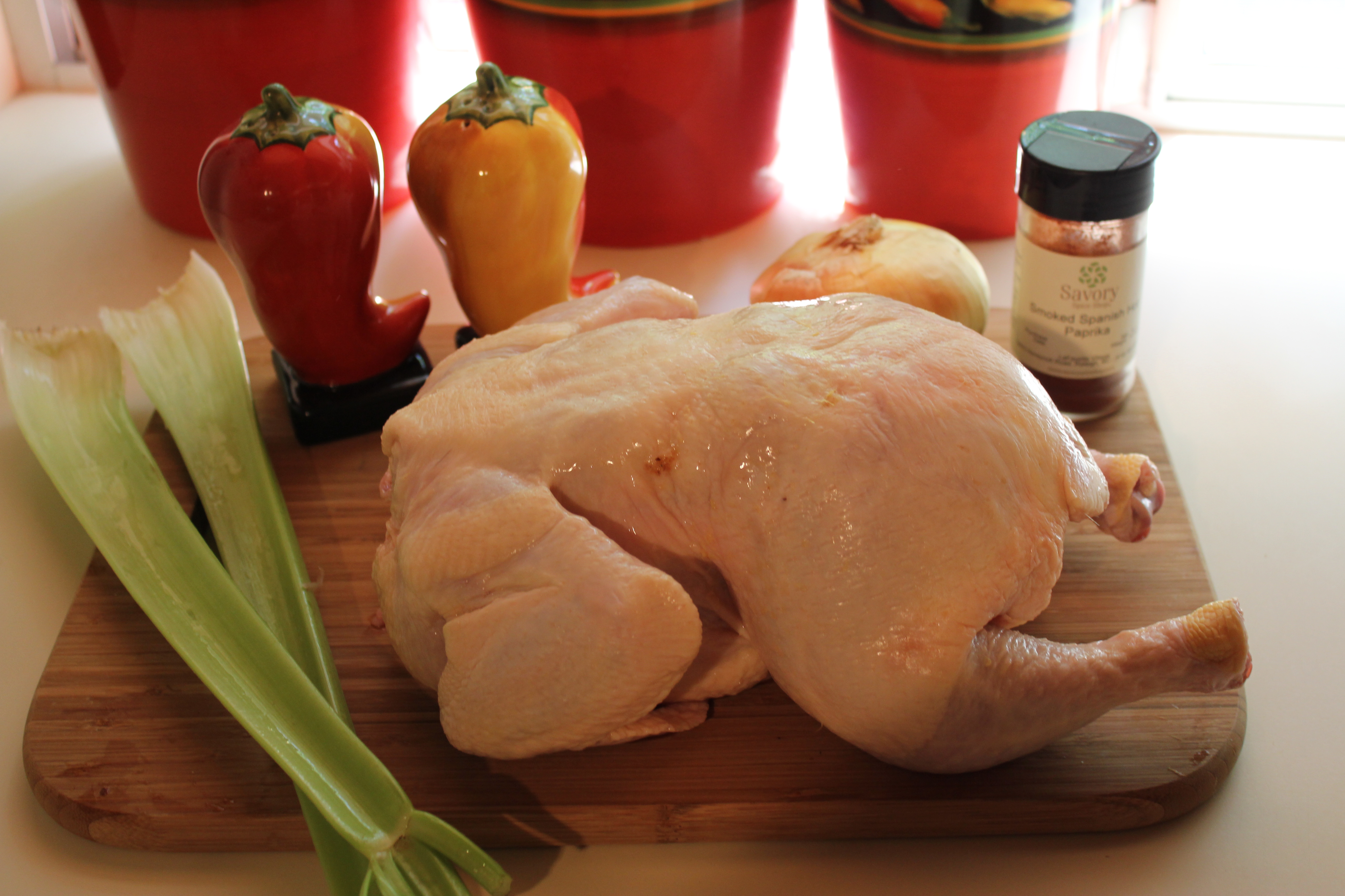 Season the chicken with the salt, pepper and paprika. Place it in a large pot, add the celery and onion, and cover with water. Bring to a boil, and then simmer for 4 to 5 hours, until the chicken is falling off the bones.