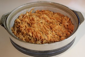 Remove the chicken meat (I use both white and dark) from the bones and skin, and place in a large bowl. Shred it with a fork.