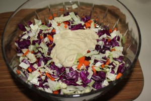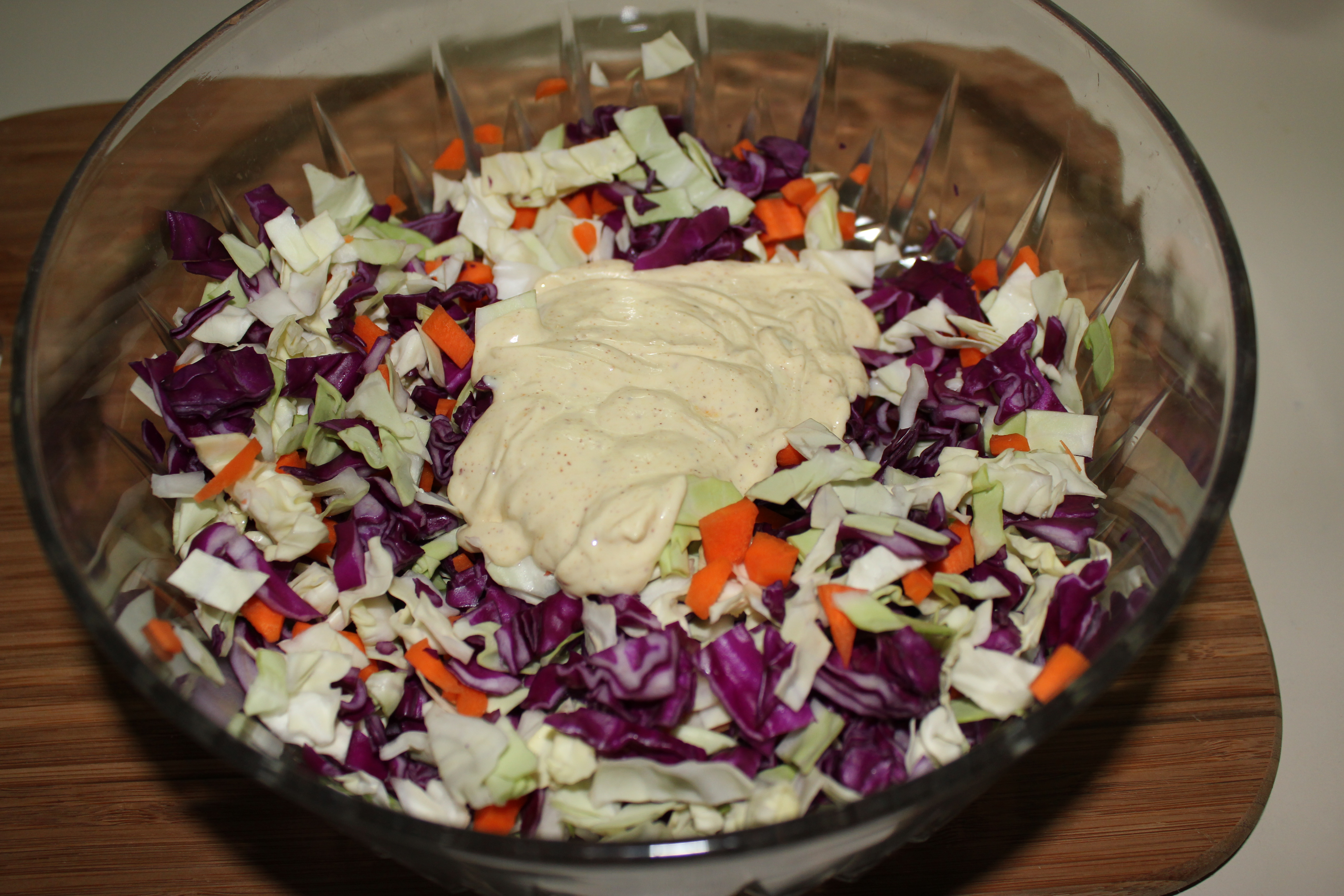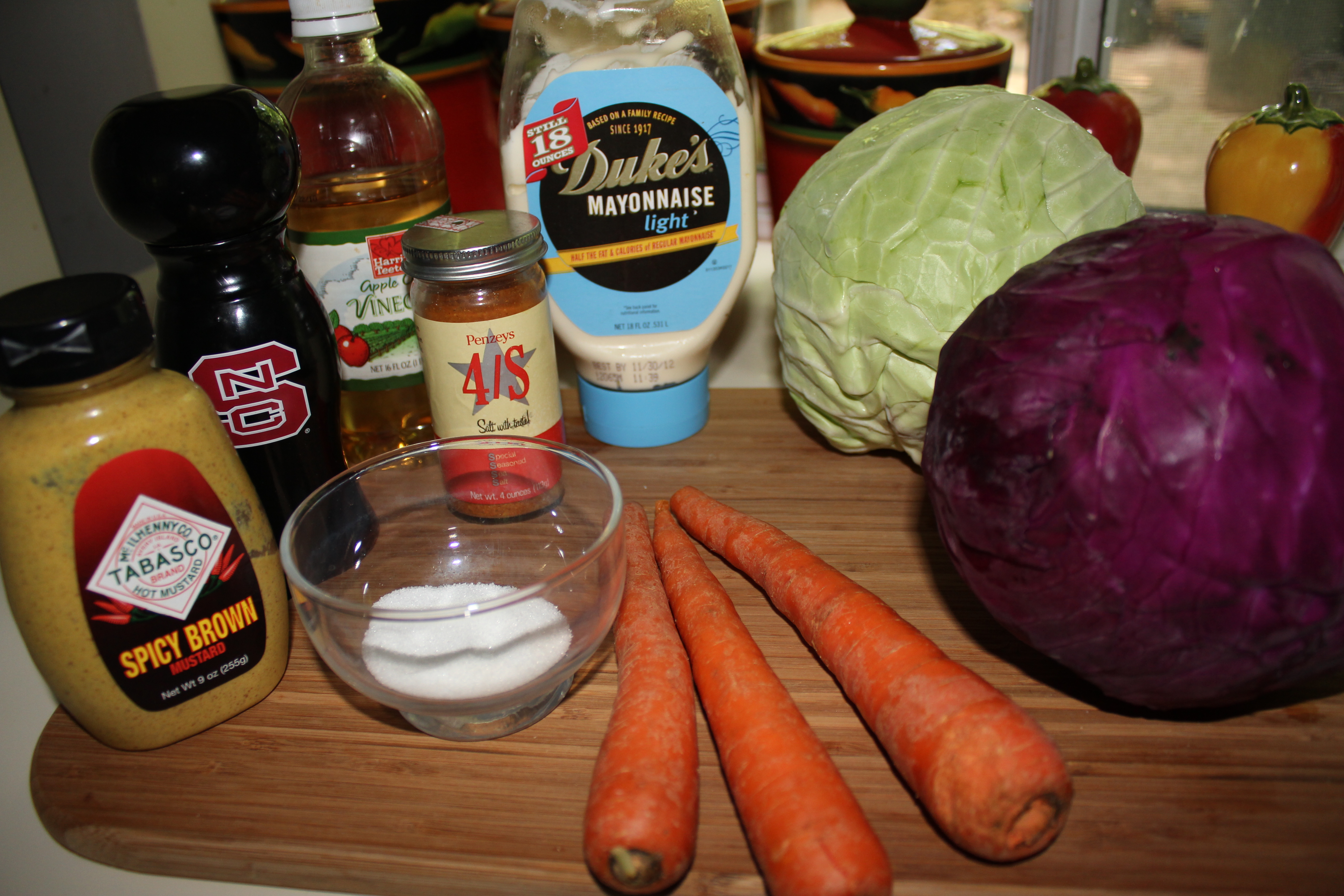 Place the chopped cabbage and carrots in a large bowl. In a medium bowl, mix together the mayonnaise, mustard, vinegar, sugar, salt and pepper.