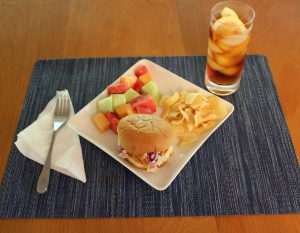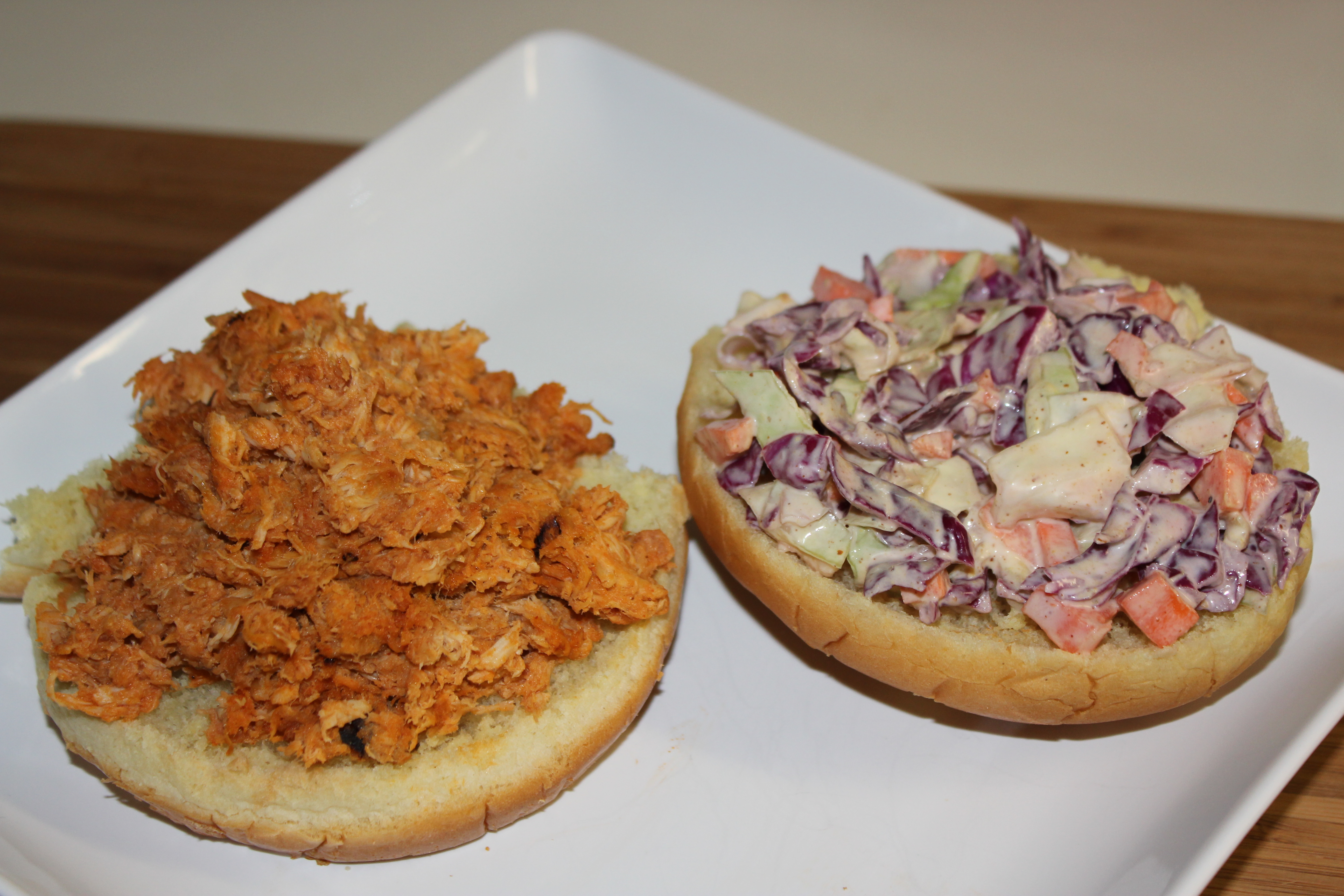 Take a sandwich roll and add a big helping of the chicken-que. Top with the creamy, crunchy coleslaw. Serve with chips, fruit salad and a big glass of iced tea – Yum!