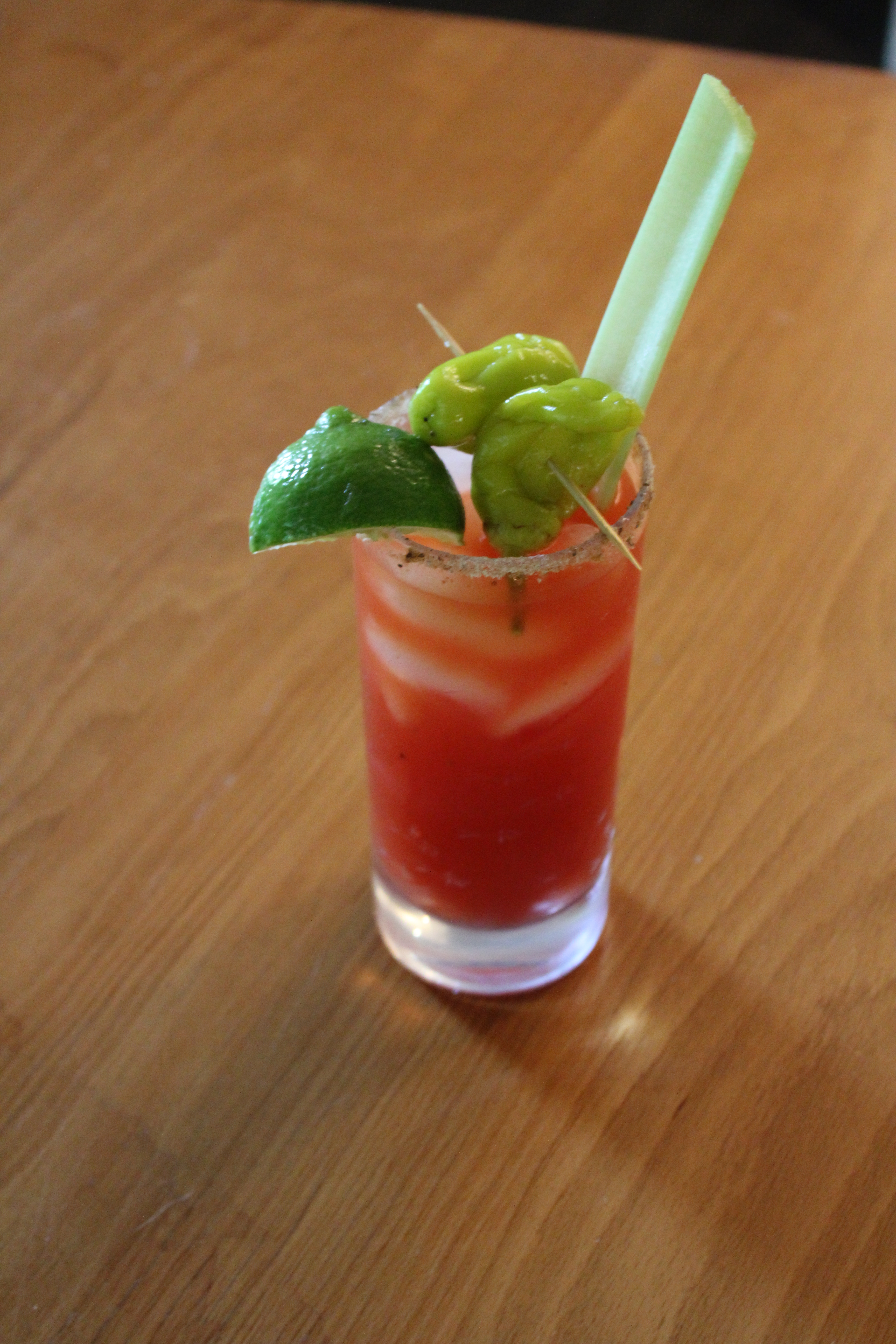 Moisten the rim of a tall glass with lime, and twirl it in Bloody Mary rimmer spice mix (available at most grocery stores.) Fill the glass with ice. Add 2 oz. of pepper-infused vodka and then fill with Clamato juice (you can also use tomato juice or V-8 if desired.) Add a couple of splashes of Worstershire sauce and stir well. Add salt, pepper and hot sauce to taste (my pepper-infused vodka had a good bite to it, so I didn’t need additional seasonings except for a dash of salt.) Garnish with a celery stalk, pepperocinis (large olives work well, too) and lime. Awesome!