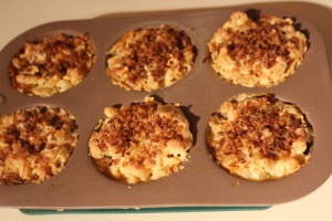 Fill each of the wells of the muffin tin with the mac-n-cheese and sprinkle with the panko crumbs.