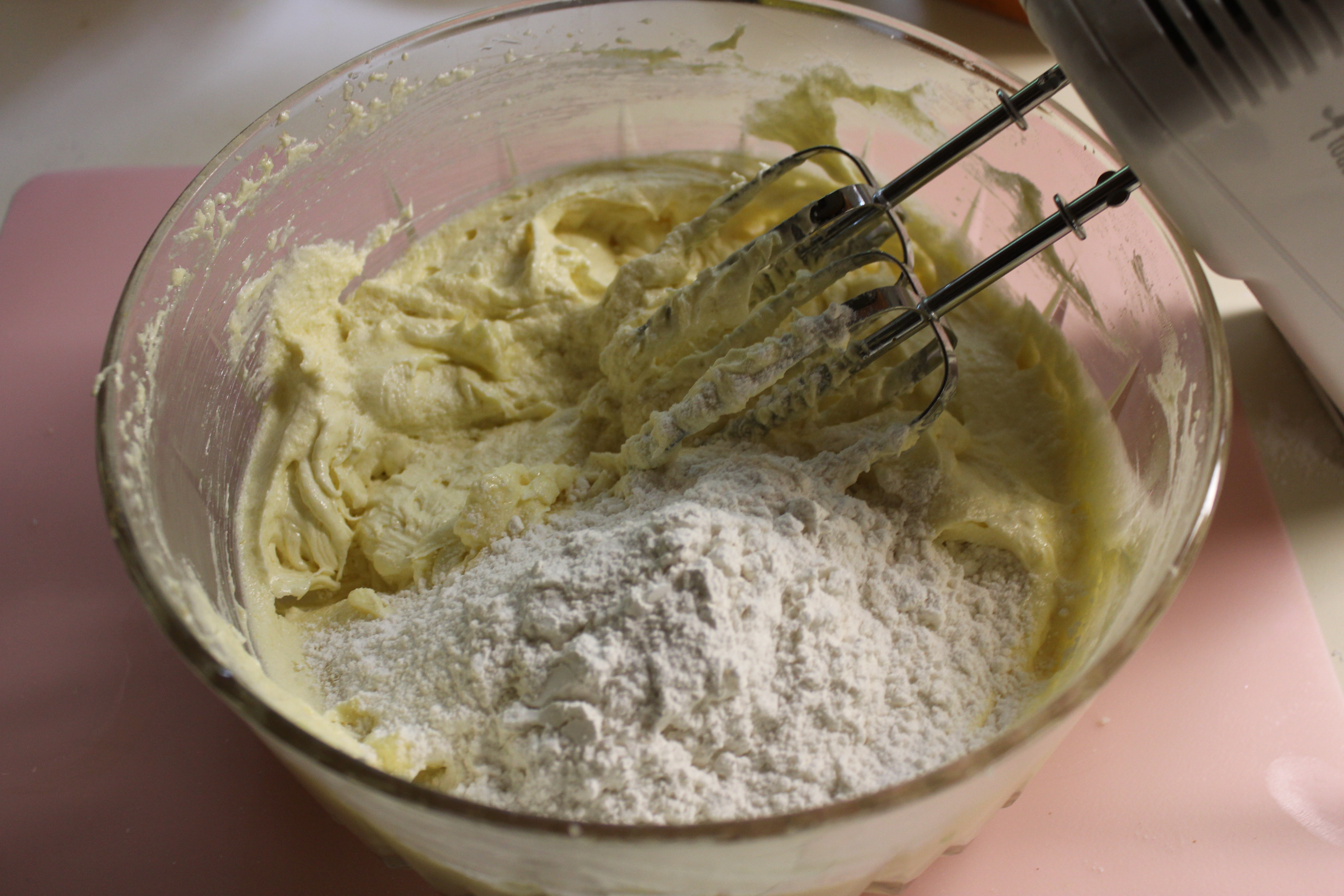 In another large bowl, beat butter until smooth with an electric mixer. Add sugar and mix for a couple of minutes until it is fluffy. Add the eggs and beat well. Add the lemon juice, lemon peel and vanilla and mix until blended.