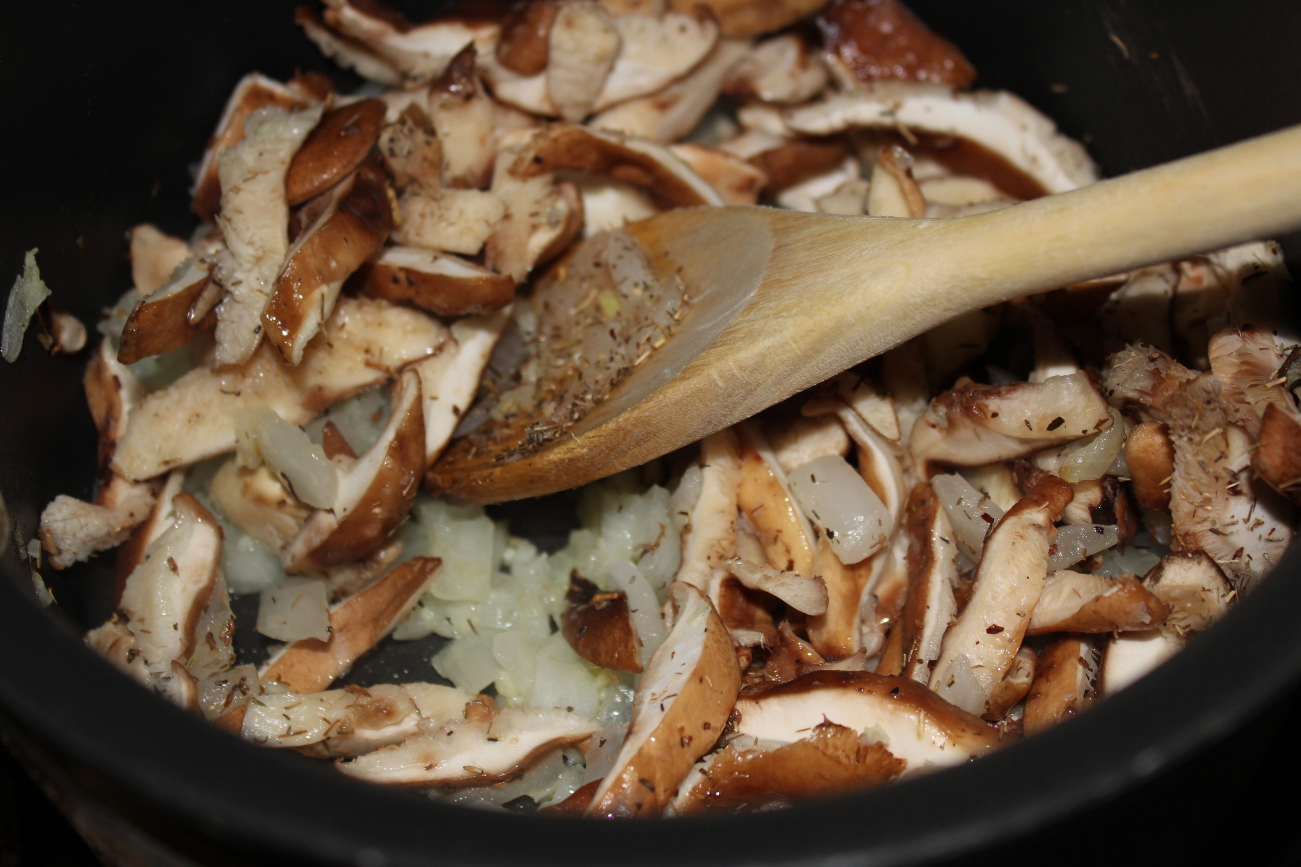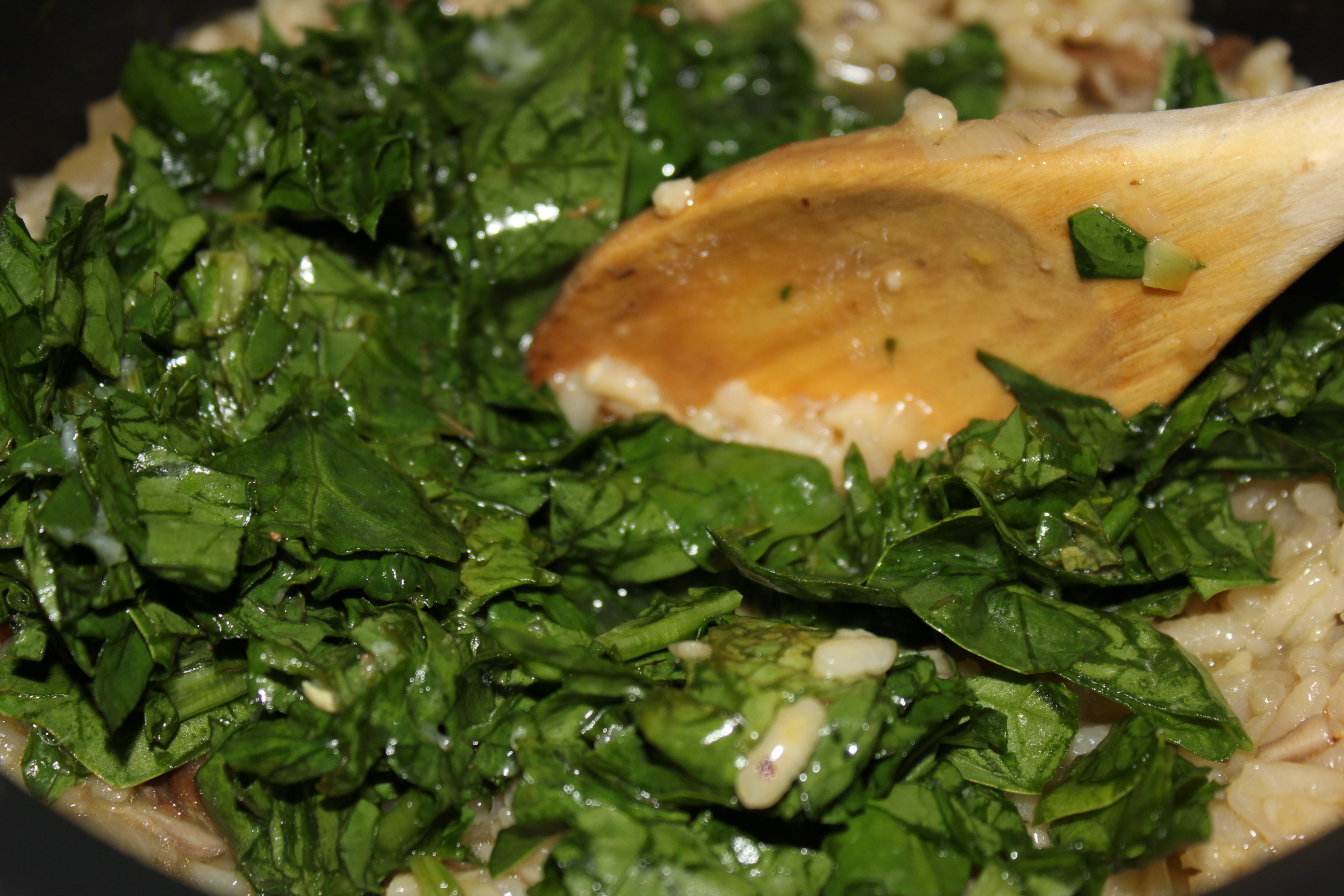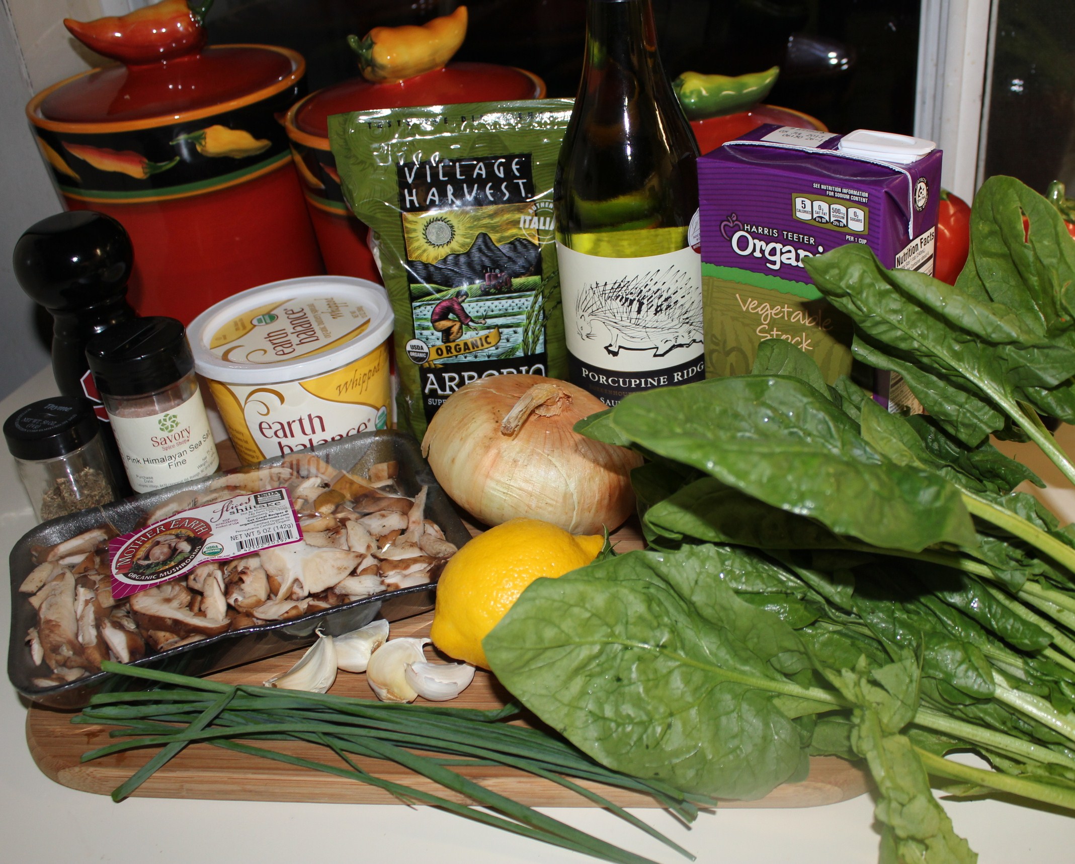 I just started a brief vegan diet (more about that in an upcoming post) and decided to make some mushroom risotto, hoping to create something where I would not miss the cheese. I found several recipes online that I thought might work (but was still skeptical – risotto without cheese???) and combined ingredients from a few of them to come up with this delightful mushroom and lemon-spinach risotto. The lemon gives it a Mediterranean feel and makes the dish light and refreshing. And believe it or not, it is creamy, without the cheese!