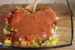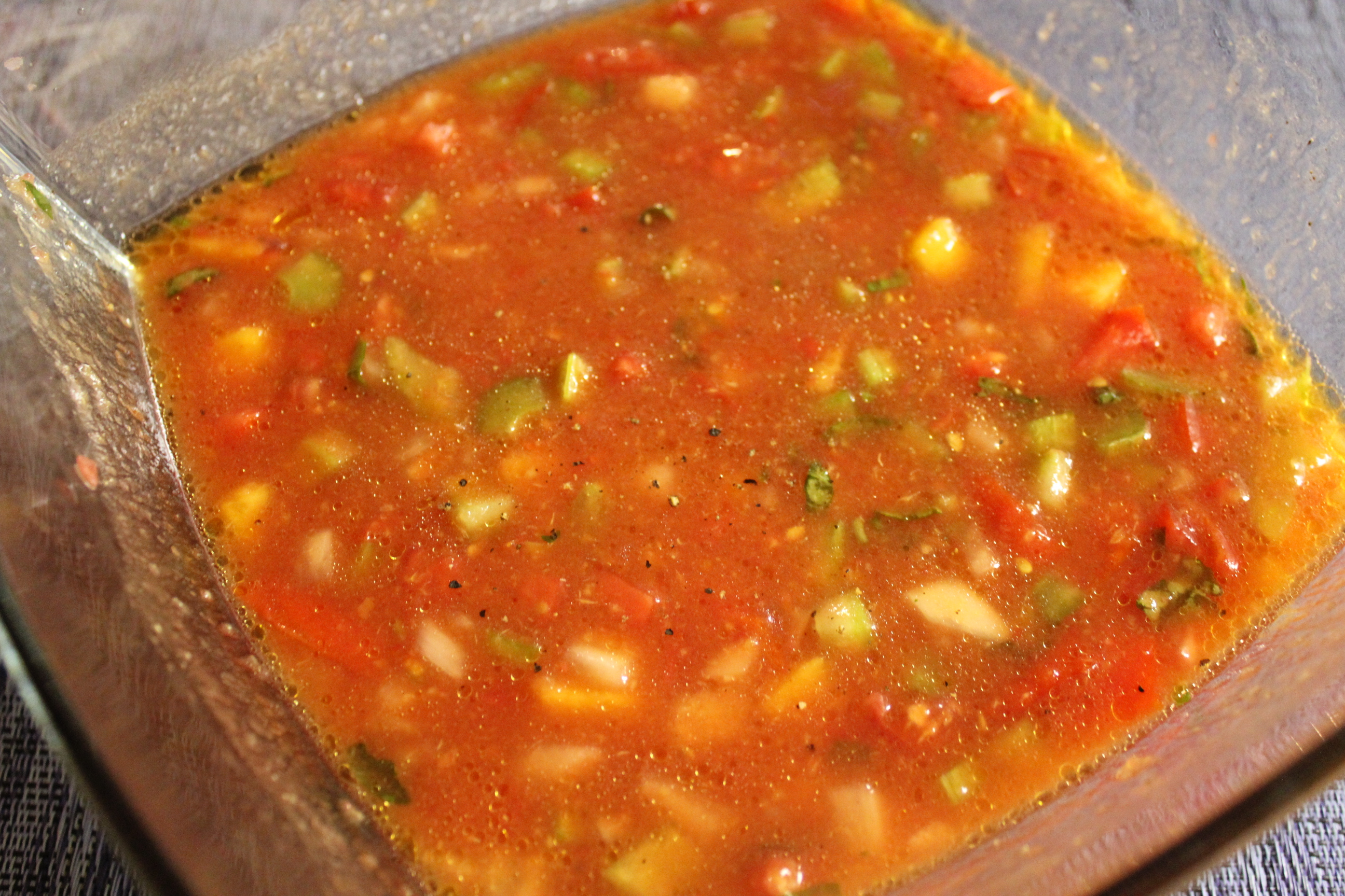 Add the vegetable juice, olive oil, vinegar, sugar, salt and pepper and stir until well blended.