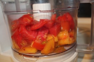 Put the roughly chopped peaches and tomatoes in a food processor and blend until smooth.