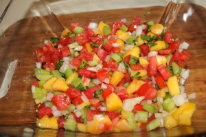 Place the diced peaches, diced tomatoes, celery, onion and basil in a large bowl and mix well.