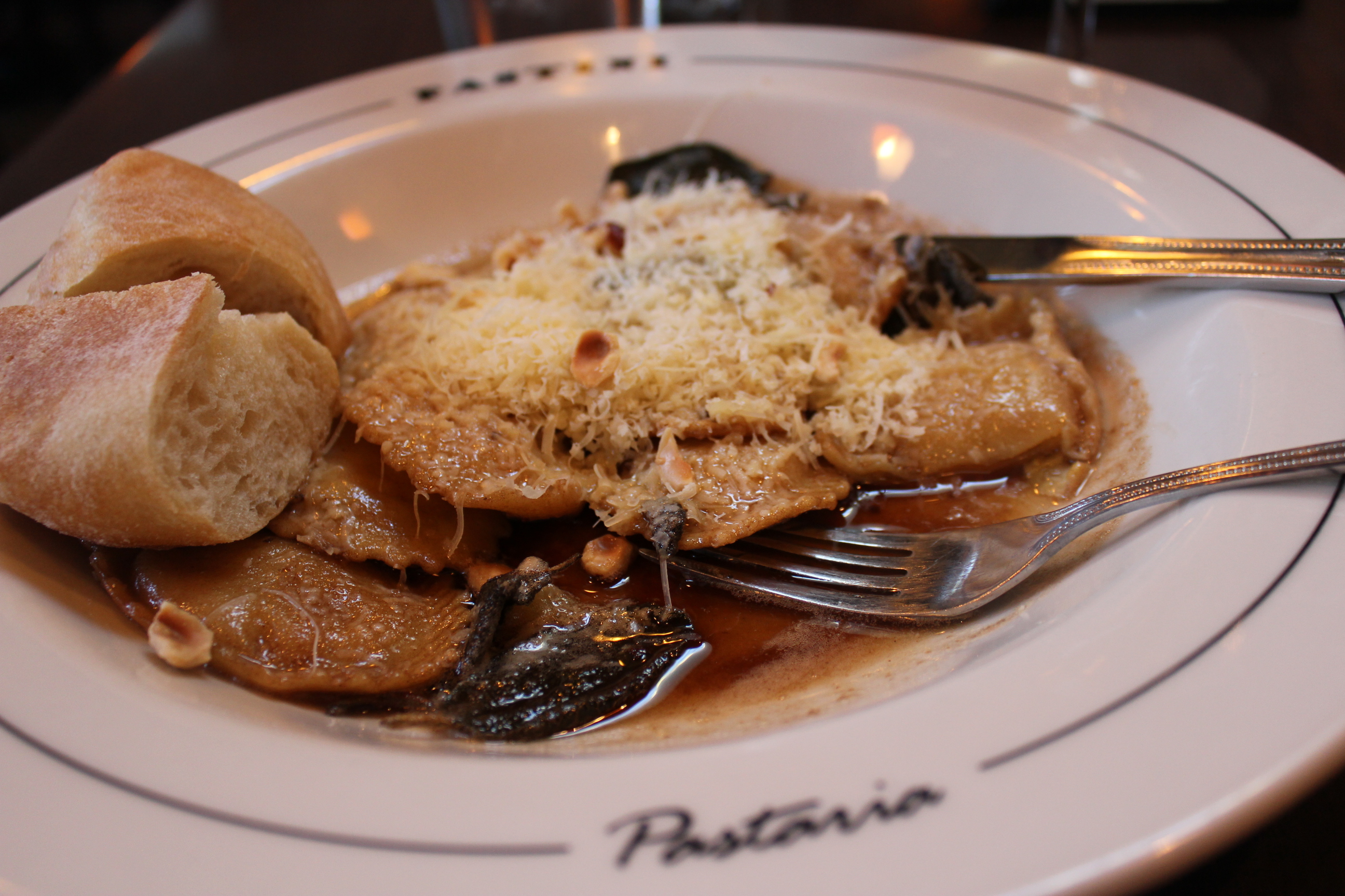 I arrived the day before the conference and decided to eat dinner close to my hotel since I was tired after traveling from coast to coast. I wound up at Pastini Pastaria (1426 NE Broadway, Portland, Ore., 97232.) I had the butternut squash-gorgonzola ravioli, which was recommended by my excellent server Mariana. It came with sage brown butter sauce and toasted hazelnuts ($11.95) and was the comfort food I needed after a long day on planes. The pasta was tender, hazelnuts plentiful and the cheese was fresh and lots of it. Perfect meal to end the day.