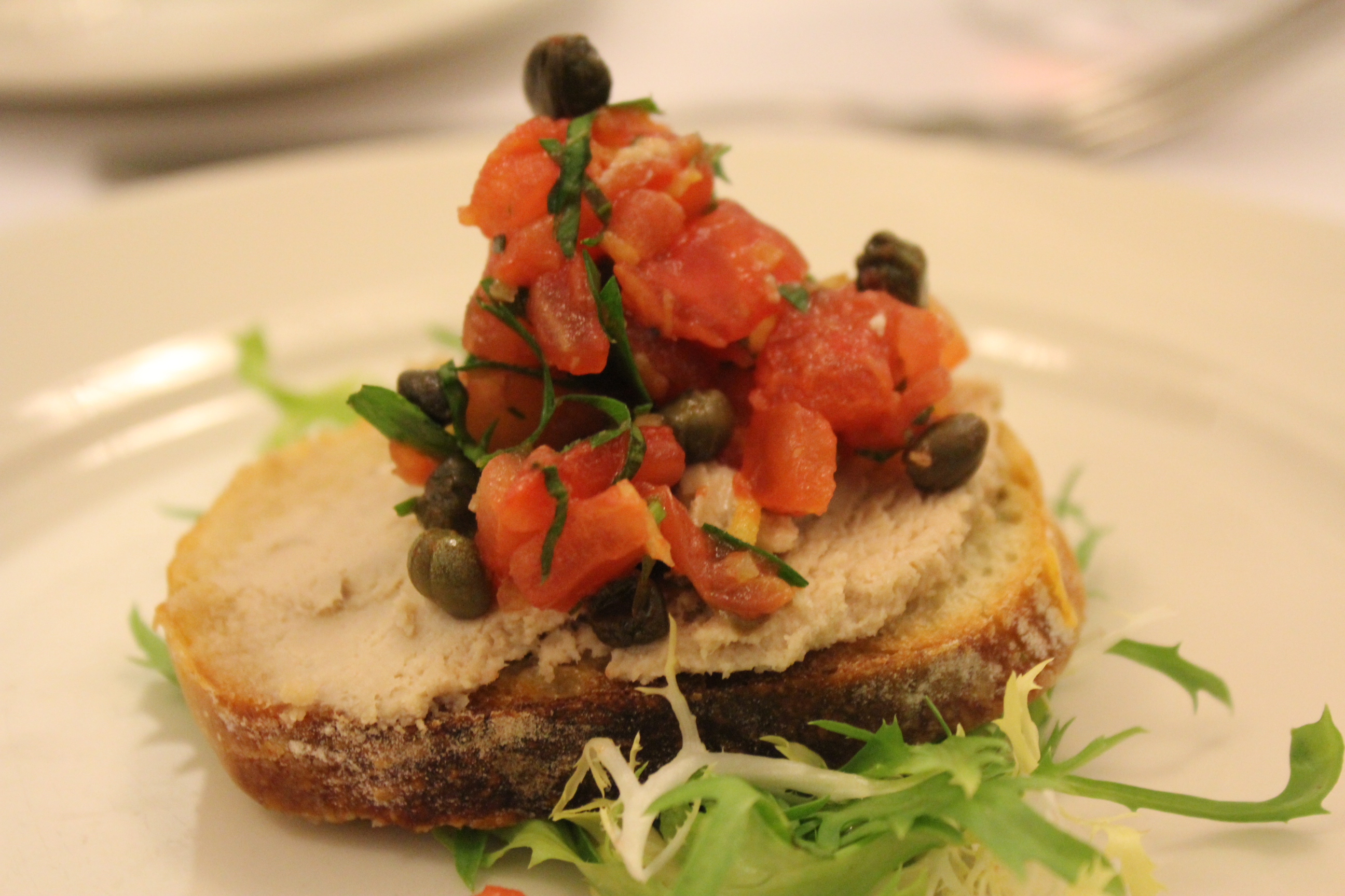 The first course was tuna pate crostini with tomato, fried capers and lemon zest. What an explosion of flavors – the saltiness of the capers, creaminess of the pate and tartness of the lemon made this one of my favorite foods of the evening.
