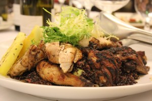 The main course was jerk spice Draper Valley chicken over black quinoa with roasted strawberries, with grilled watermelon and Frisée salad, served family style.