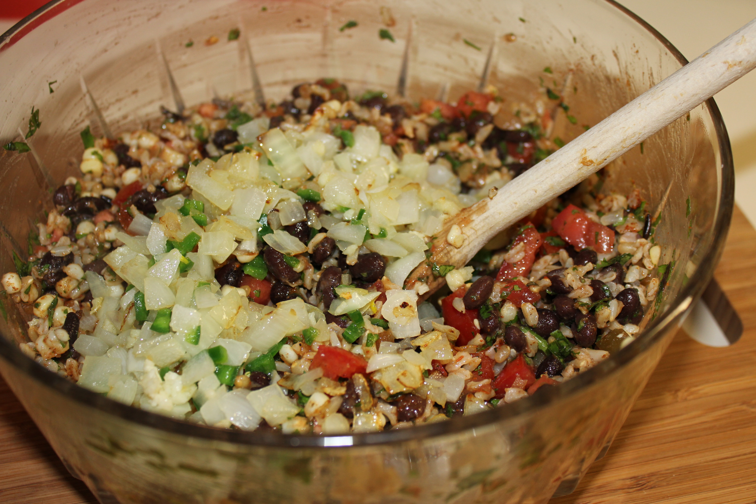 Meanwhile, mix the black beans, rice, corn, tomatoes, salsa, cilantro and seasonings in a large bowl. Add the onions, etc., and squeeze in the lime juice.