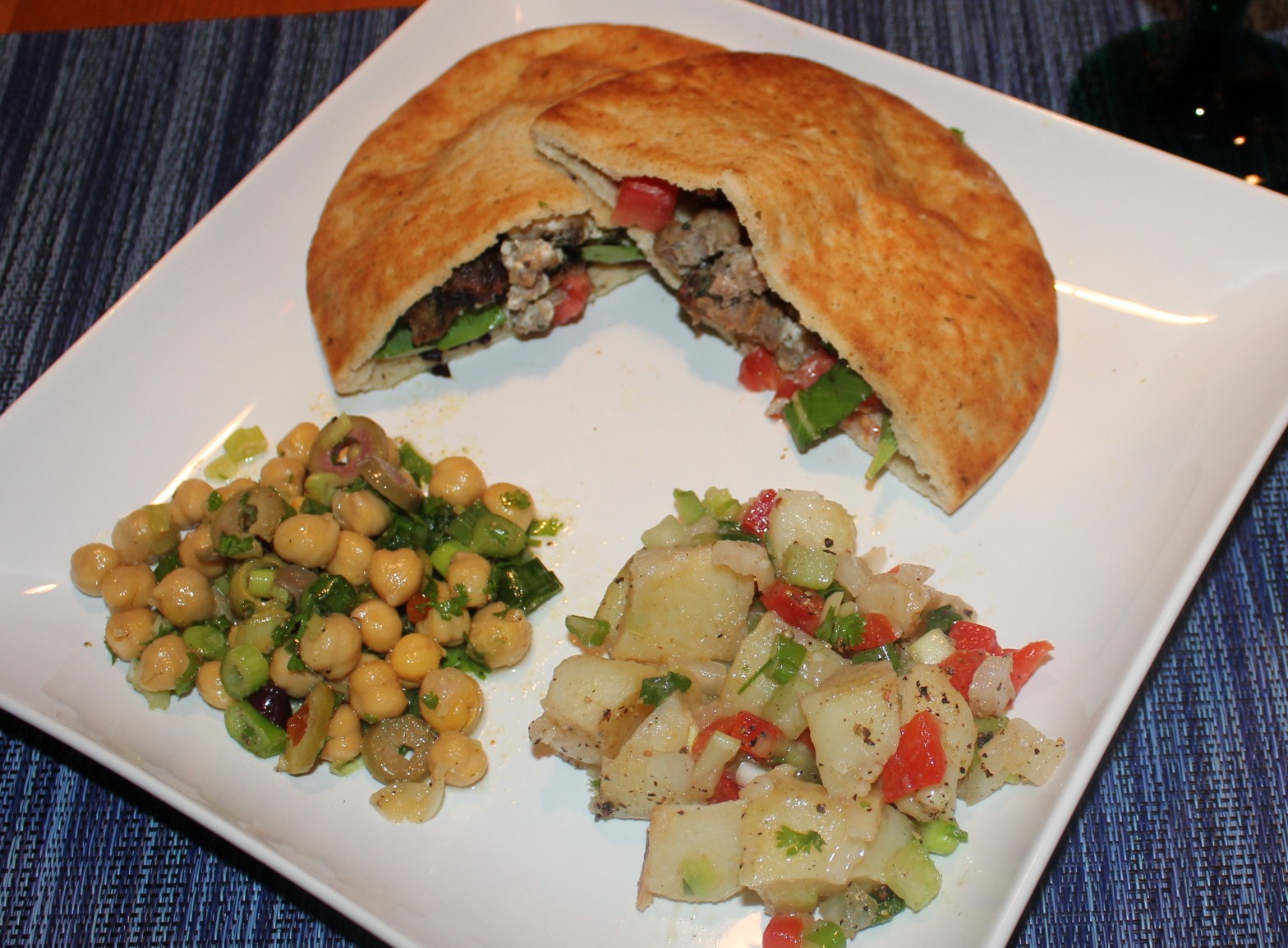 Or, you can place the burger in pita bread and add fresh tzatziki sauce, lettuce, tomatoes, etc., with a garbanzo bean and olive salad and/or a mayo-free potato salad on the side. Be on the lookout for upcoming posts on the tzatziki and salads, all of which are easy to make and delicious.