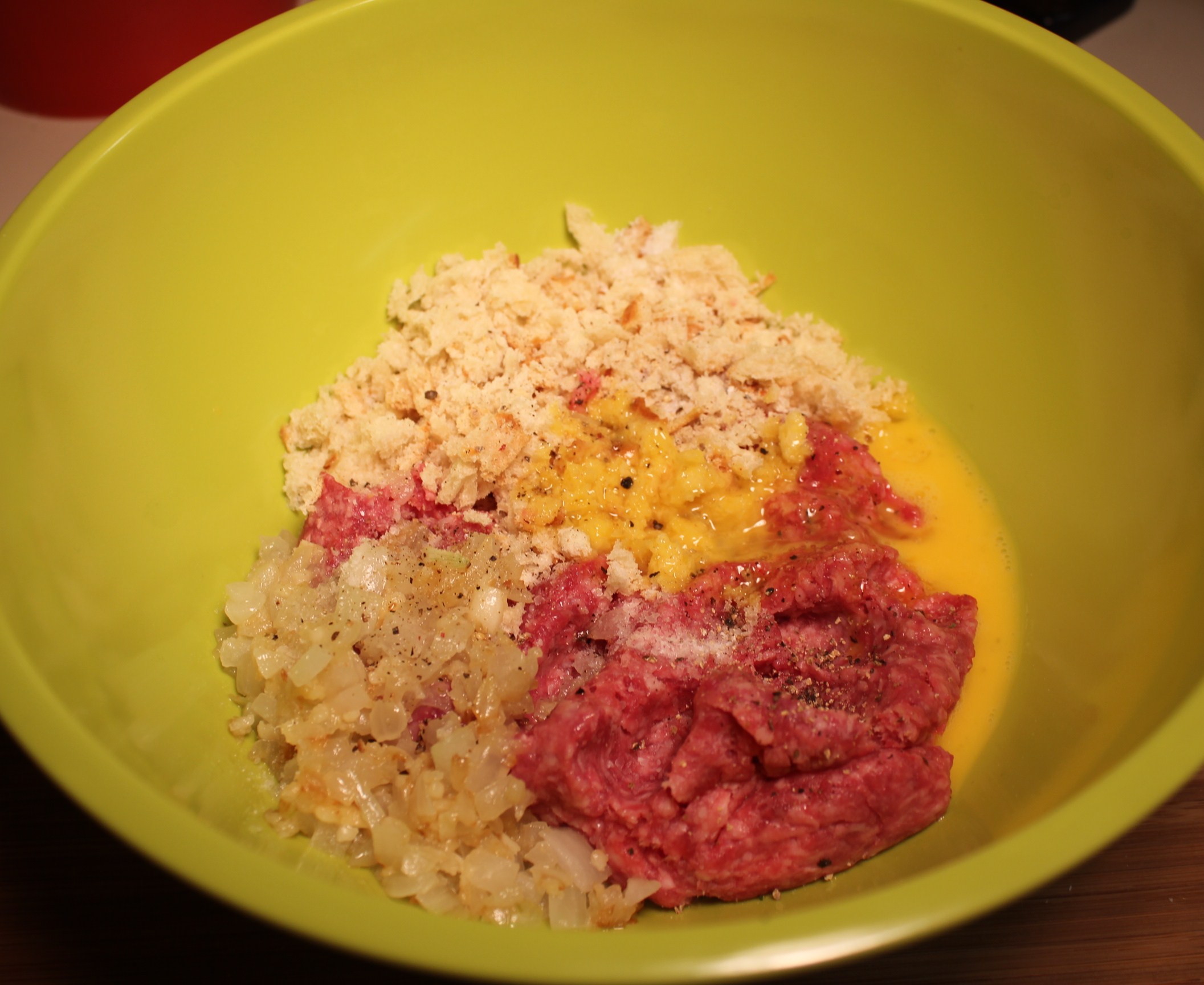 Place the lamb, sautéed onions and garlic, egg, bread crumbs, salt and pepper in a large bowl and mix together well.