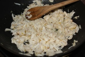 In large skillet, melt the butter over medium heat. Add the garlic and sauté for about a minute, and then add the crabmeat and cook for 2-3 minutes.