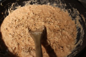 Fold in the sour cream, sherry, tomato paste, lemon juice, salt and pepper and mix well. Heat the crab mixture for several minutes, while stirring frequently. Make sure that you don’t boil the Newburg as that would make the sour cream sad.