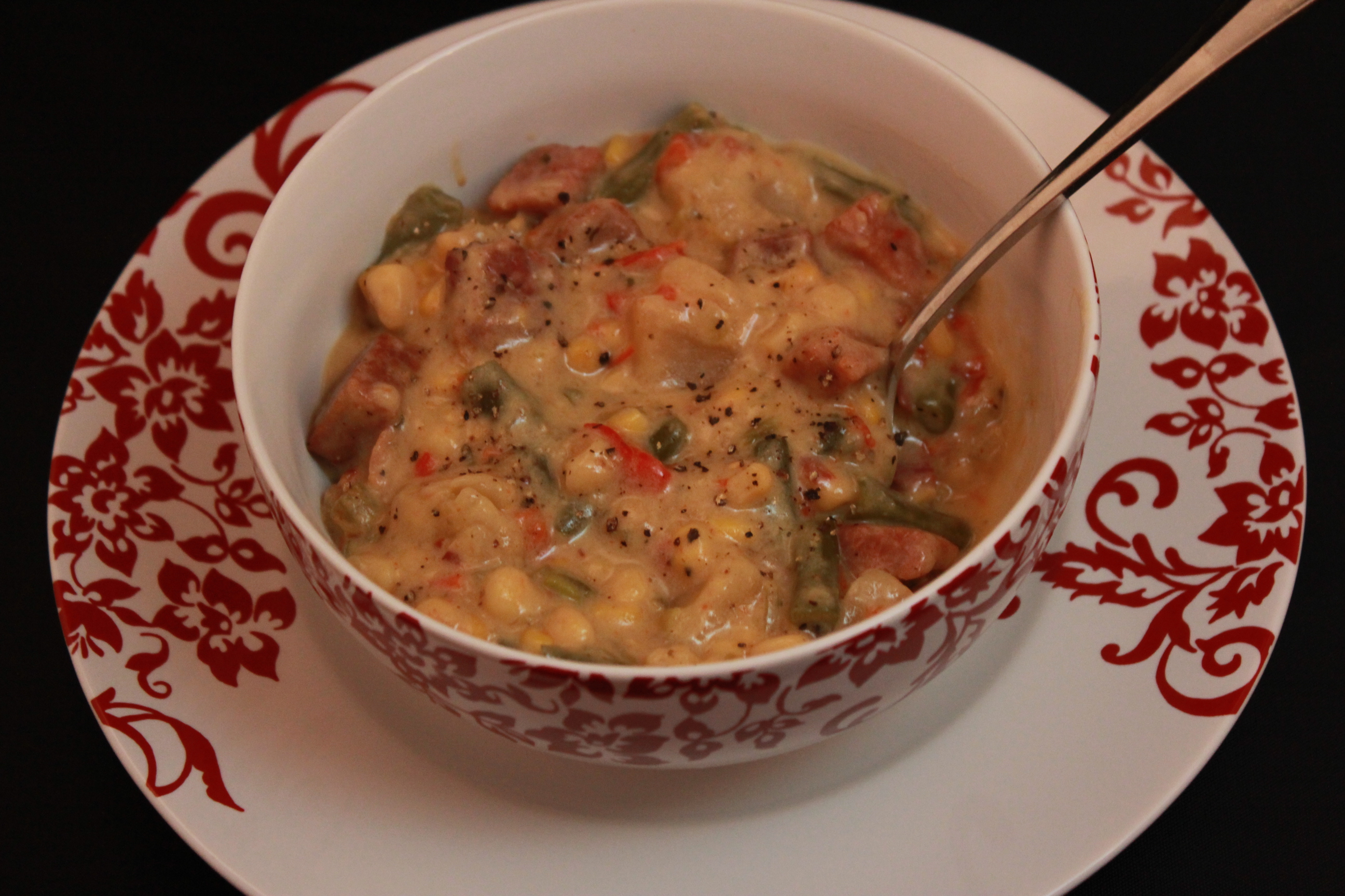 This is a hearty soup that will warm your insides. It is so creamy and the ham, potatoes, corn and red pepper taste great together. You will probably come back for seconds!