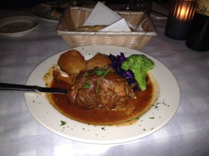 I promised myself that I would order something beside my usual moussaka ($11.95), which is out of this world and a great comfort food. I had a hard time choosing between several items on the menu, but finally chose the braised lamb shank ($21.95), which is house specialty. The lamb is braised in a tomato red wine sauce with a hint of cinnamon. It came with potatoes, red cabbage and broccoli. The portions were plentiful and the lamb was fork tender, melt-in-your-mouth crazy good.