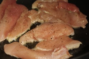 In a large skillet, heat oil over medium heat. Cut the chicken into strips, season with salt and pepper, and sauté in the oil for several minutes on each side, until cooked through. You may need to do this in a couple of batches.