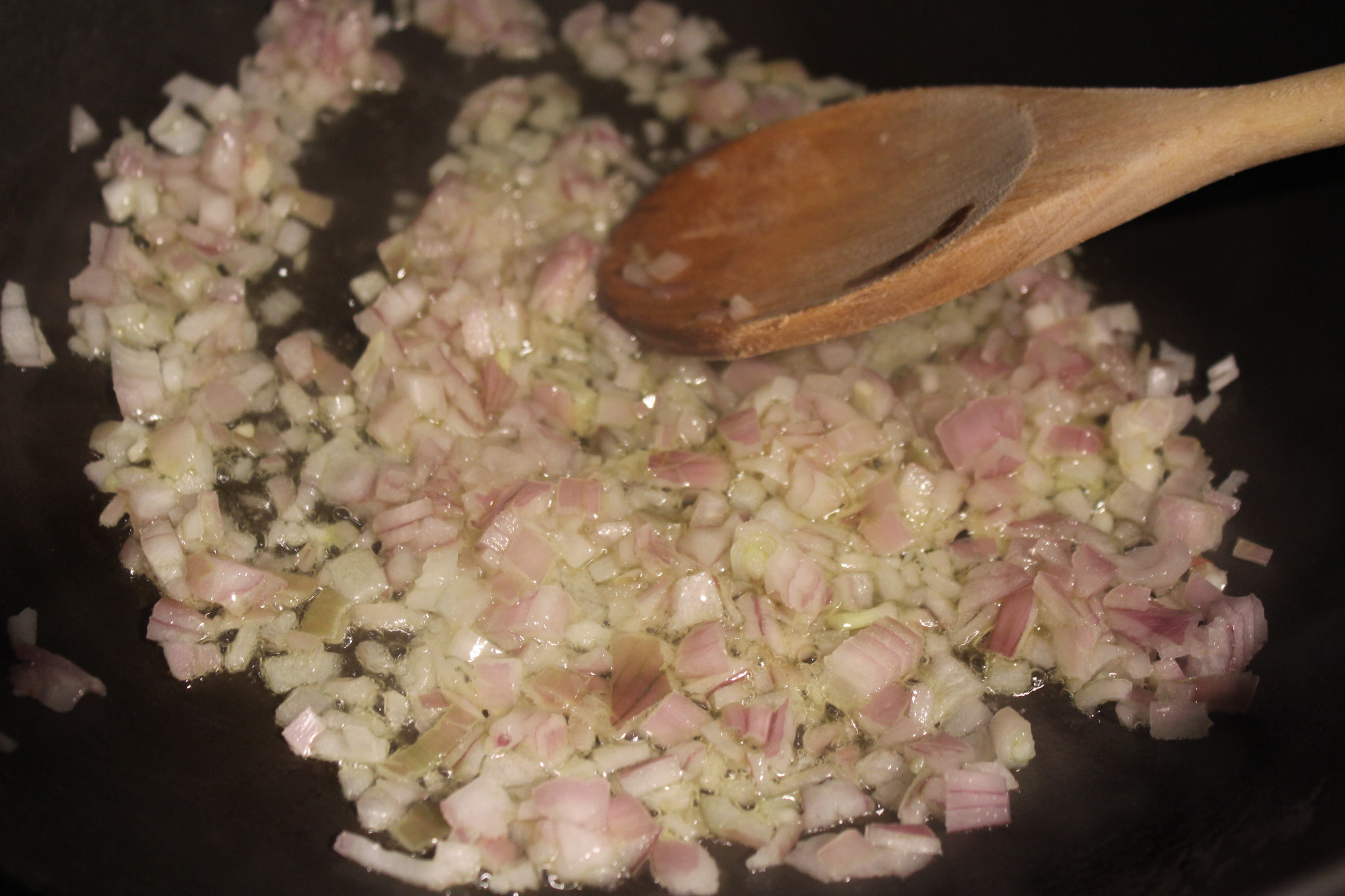Heat the olive oil in a large skillet. Add the chopped shallots, sauté for a couple of minutes and remove from the heat.