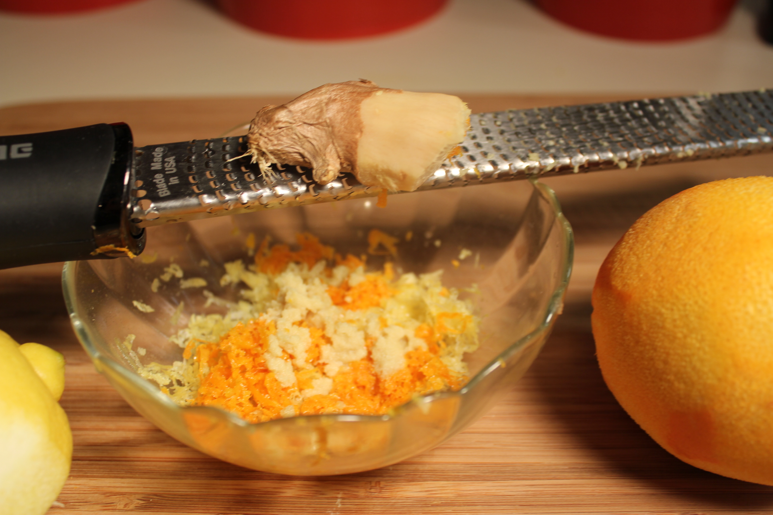 Using a microplane, grate the lemon, one of the oranges and part of the peeled ginger. Save the lemon and ginger root for other uses — the orange will be juiced.