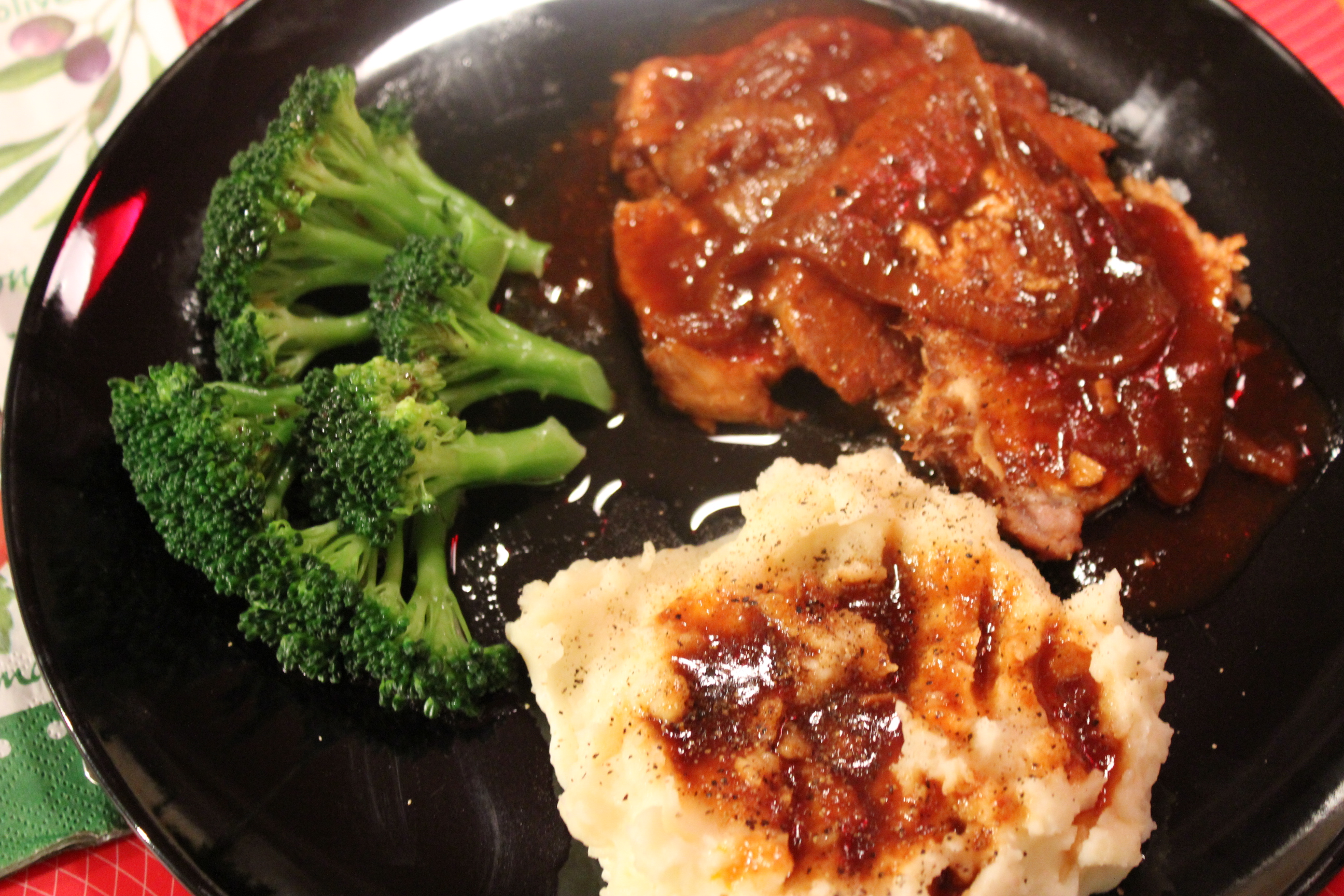 pork roast with mashed potatoes and broccoli