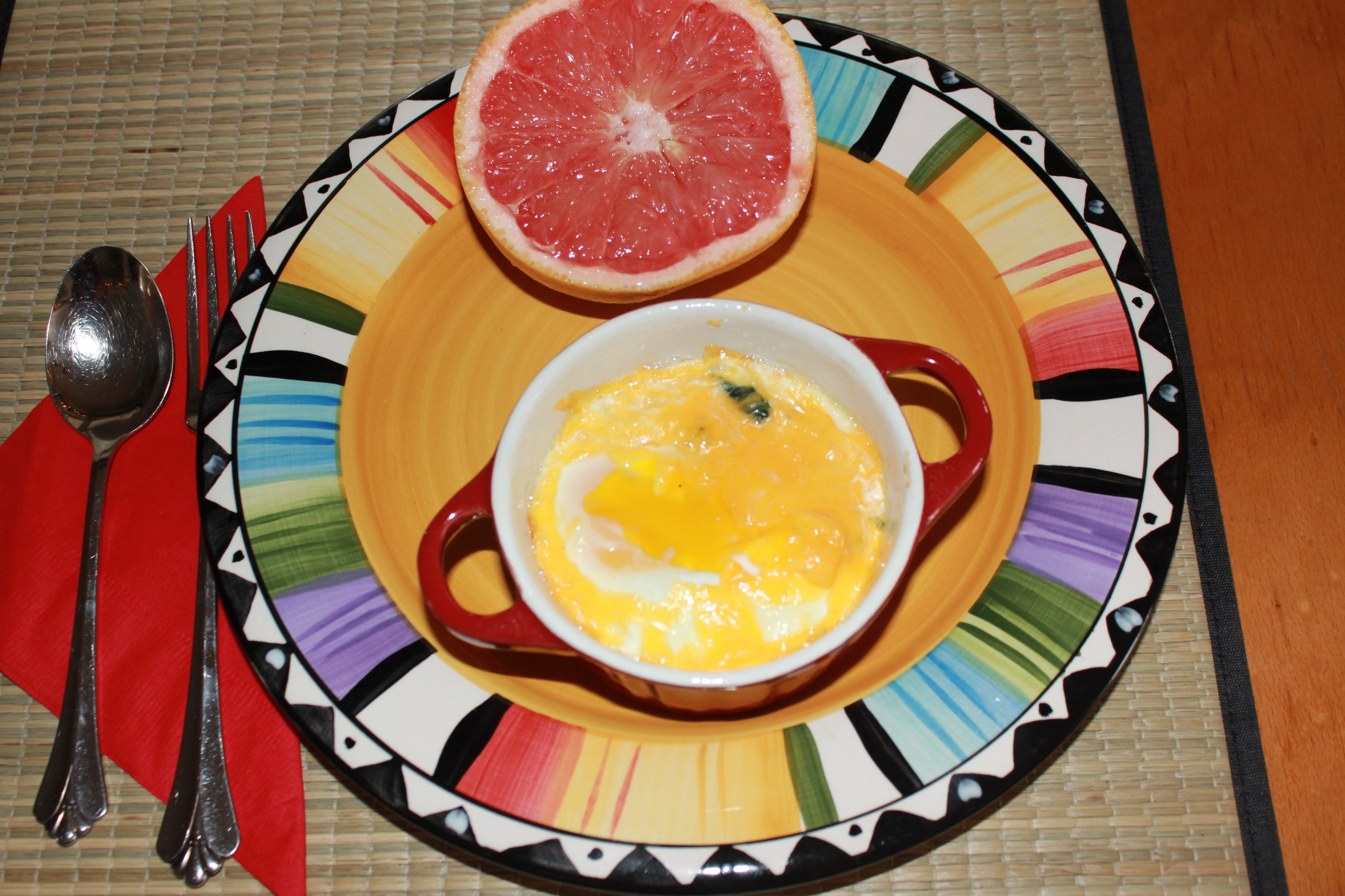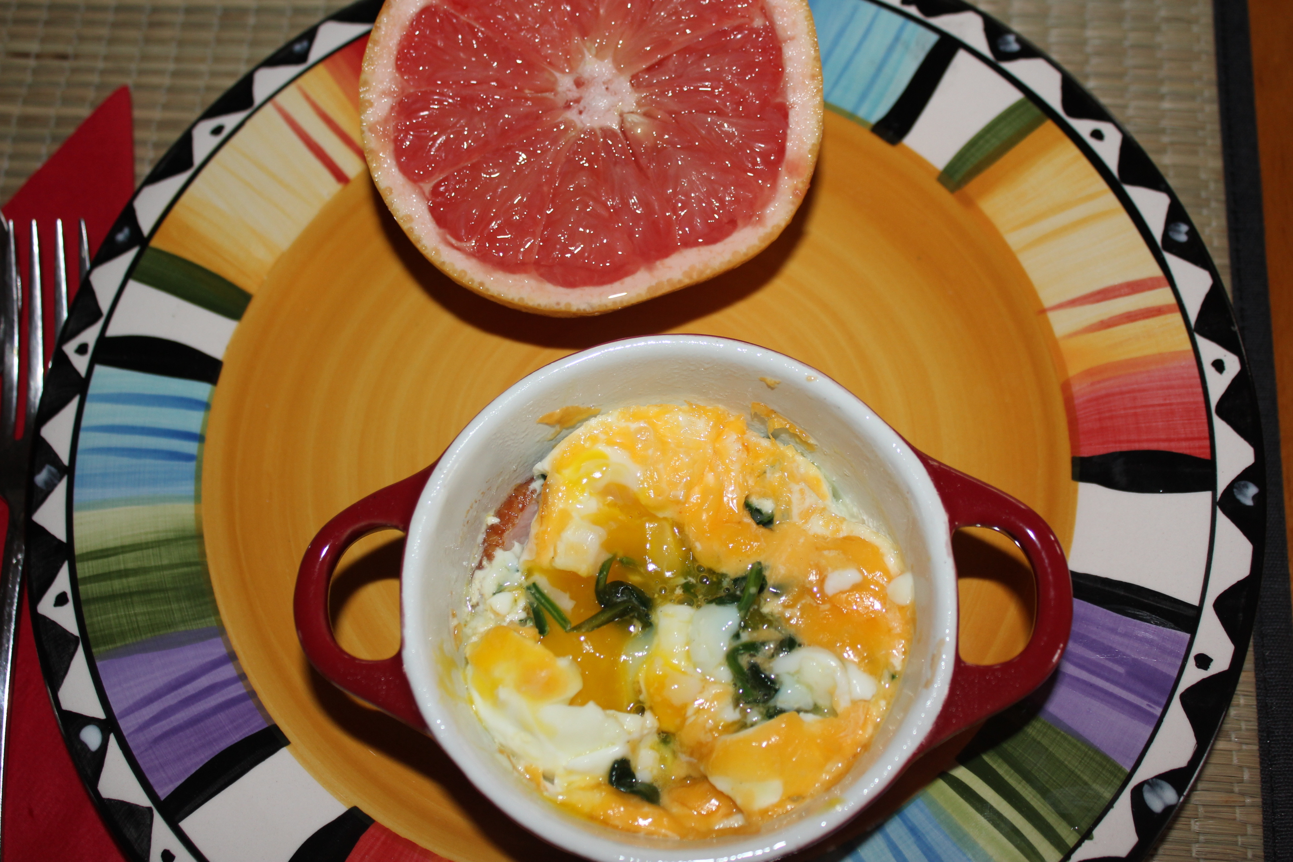 I received a great set of ramekins for Christmas (thanks, Sally!) and it didn’t take me long to figure out what I would make in them first. Years ago, my brother Joe and his family were visiting my Mom and made these great individual baked egg and ham casseroles, with cream, grated cheese and some sort of green vegetable — asparagus, maybe? I’ve altered my brother’s recipe some, substituting Canadian bacon for the ham, spinach for the asparagus and fat free half-and-half for the cream. These little casseroles rock! They remind me of Eggs Florentine, without the English muffins and Hollandaise sauce.