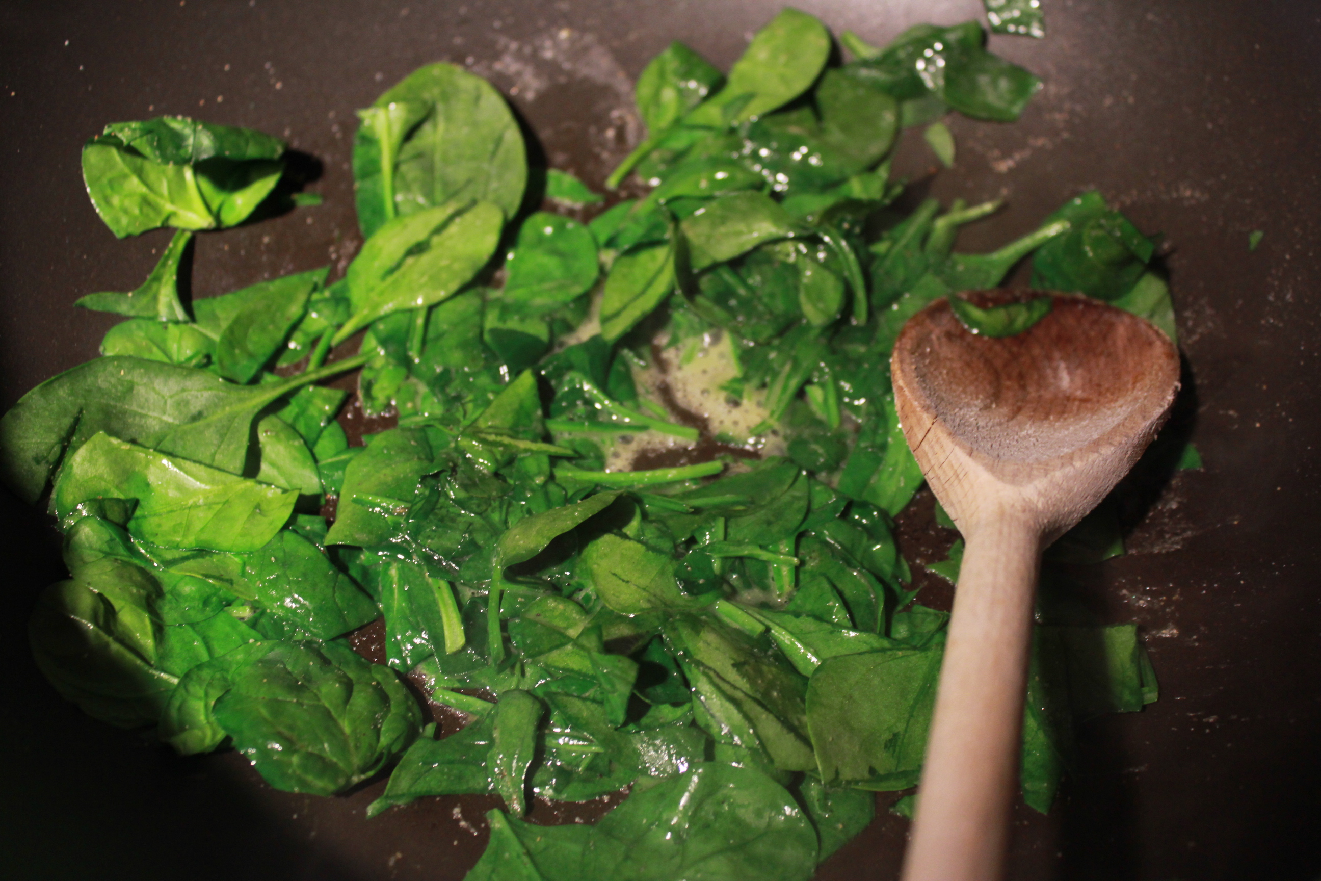 Melt butter in a medium skillet. Add the spinach and season it with salt, pepper and garlic powder to taste. Sauté until the spinach has wilted and remove from heat.