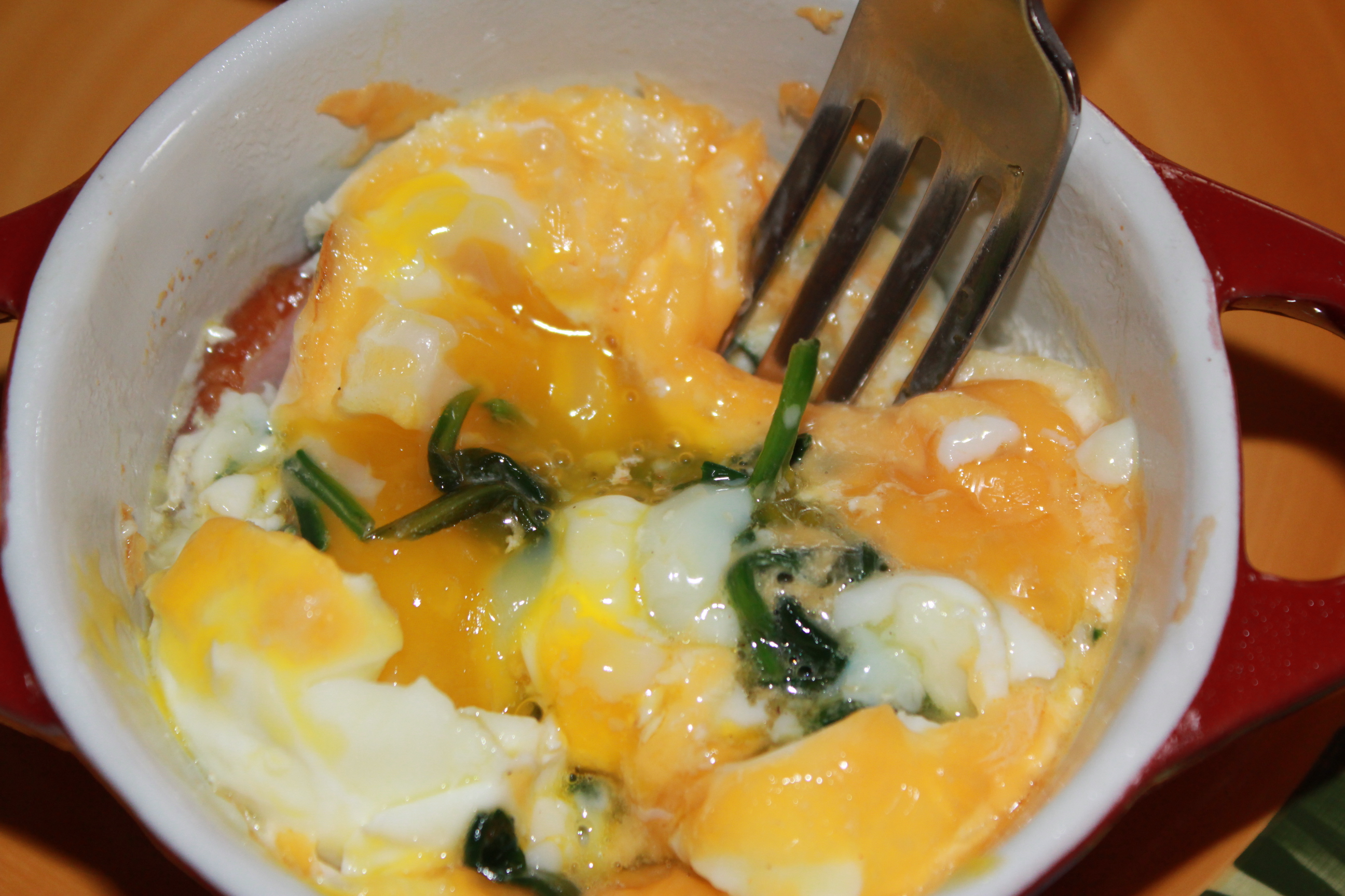 Bake for 15 minutes or so, until the egg whites have set but the yolks are still runny.
