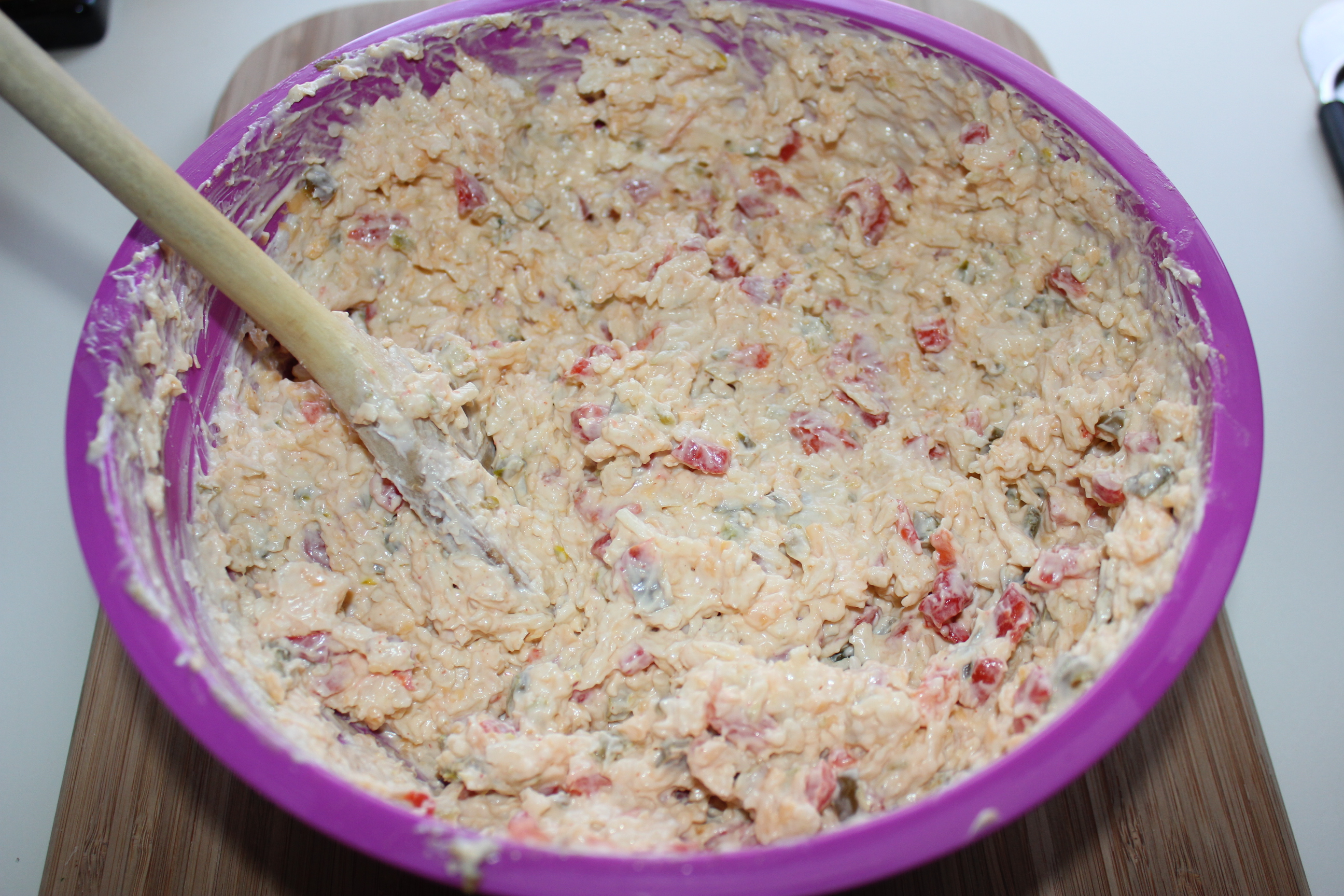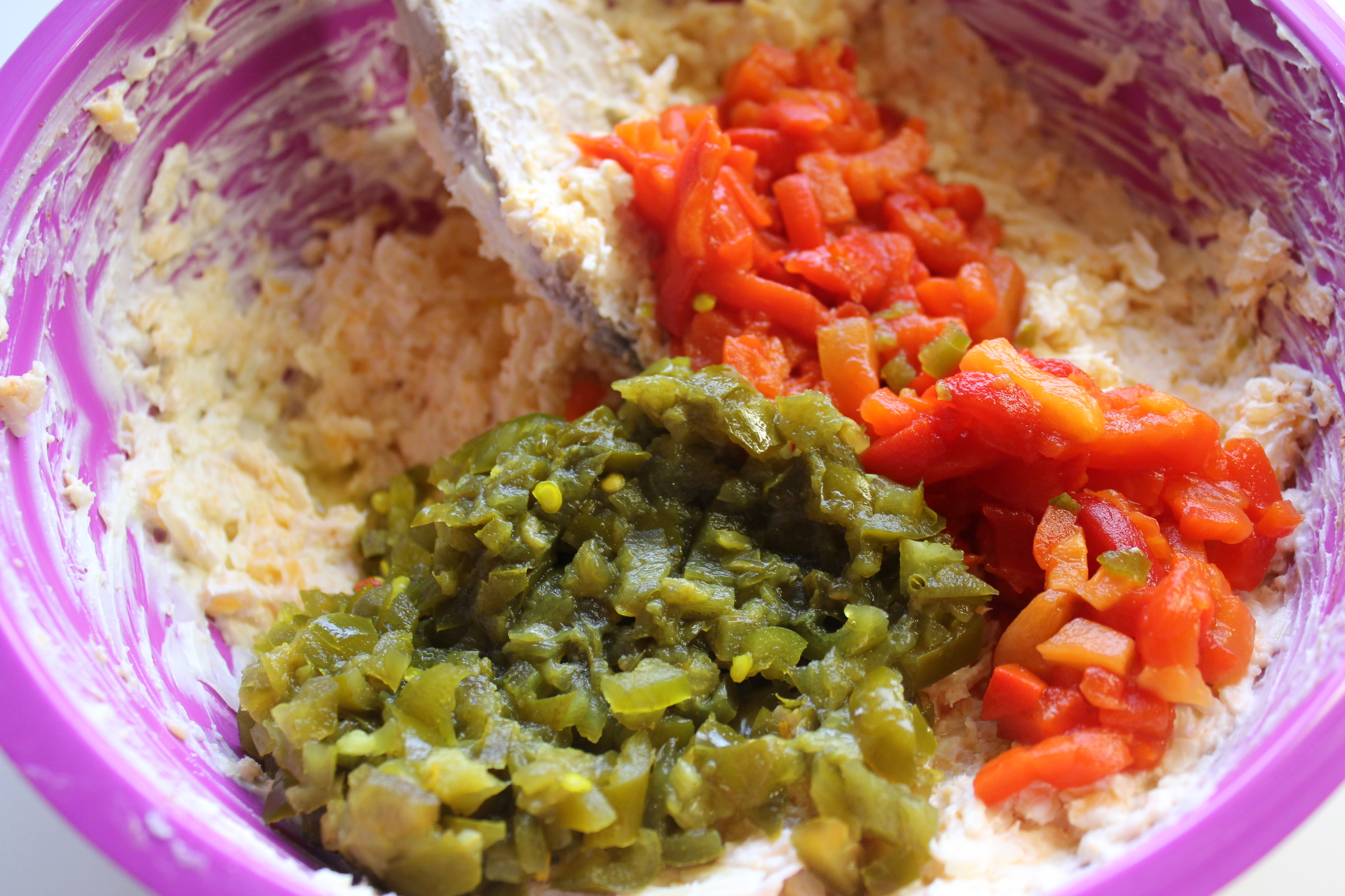 In a large bowl, mix all ingredients except the pimentos and jalapenos.