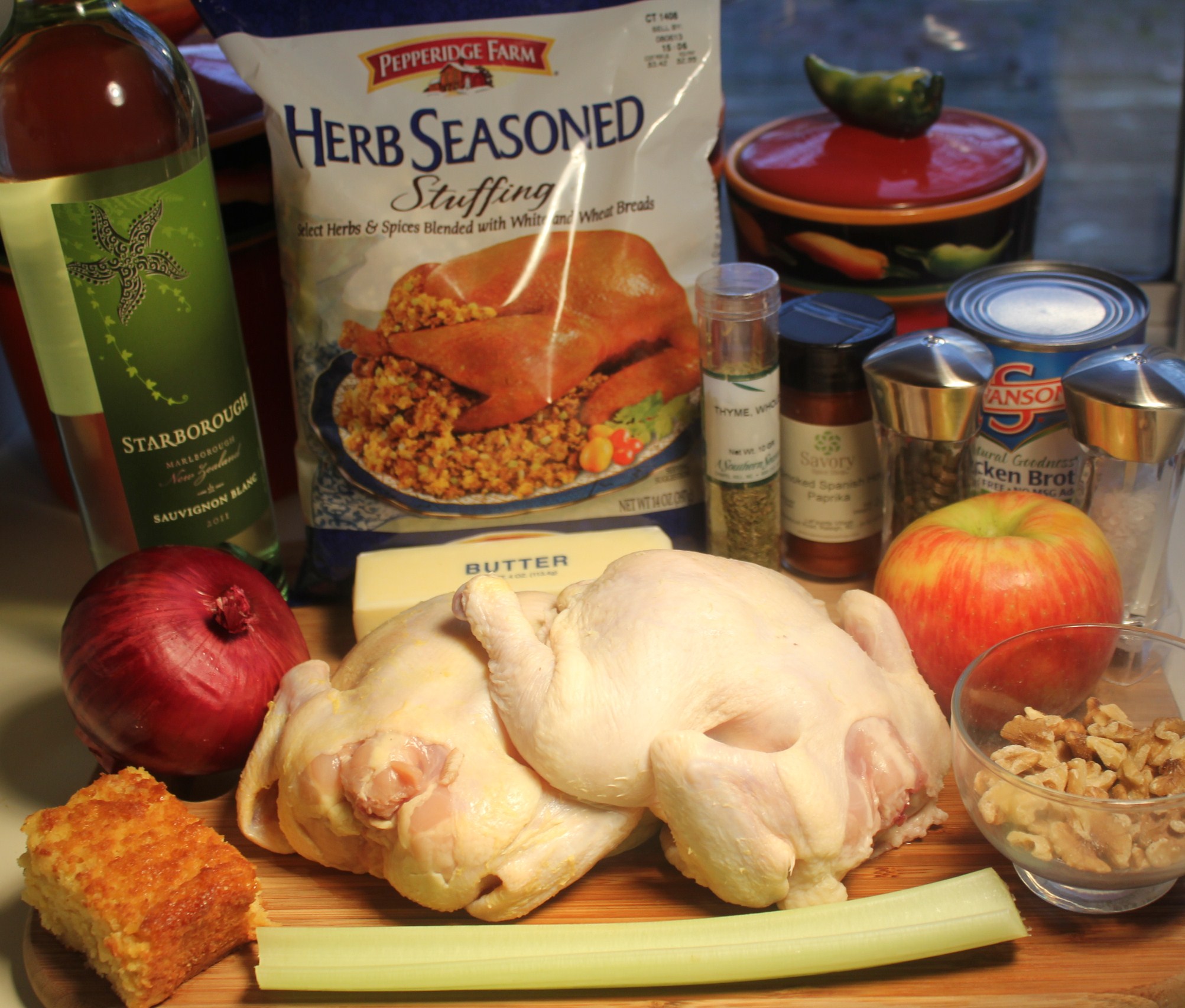 This recipe is for four Cornish hens, so if you are only making two just cut the ingredients in half. Or, if you are like me and love stuffing as a side dish, make extra – this “stuff” is so good with the crisp apples, crunchy walnuts and sweet cornbread.