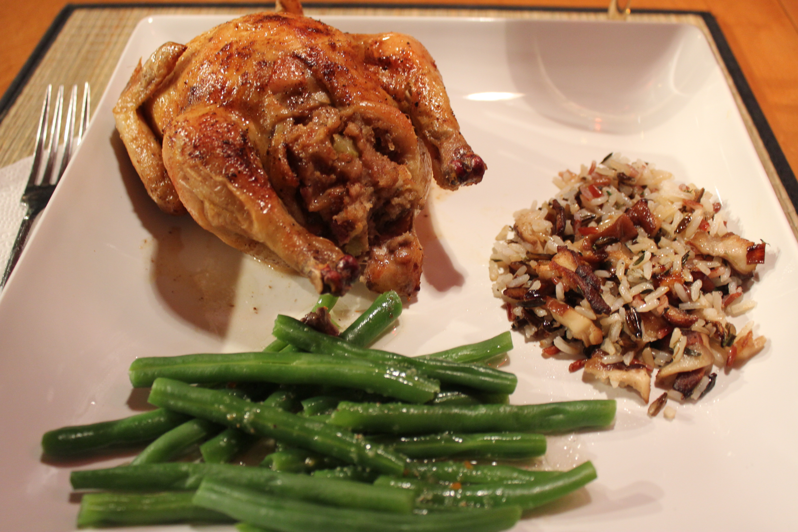 Serve with fresh green beans and a starch (I used the wild rice and mushroom stuffing from Brad’s Cornish hen and it was awesome!)