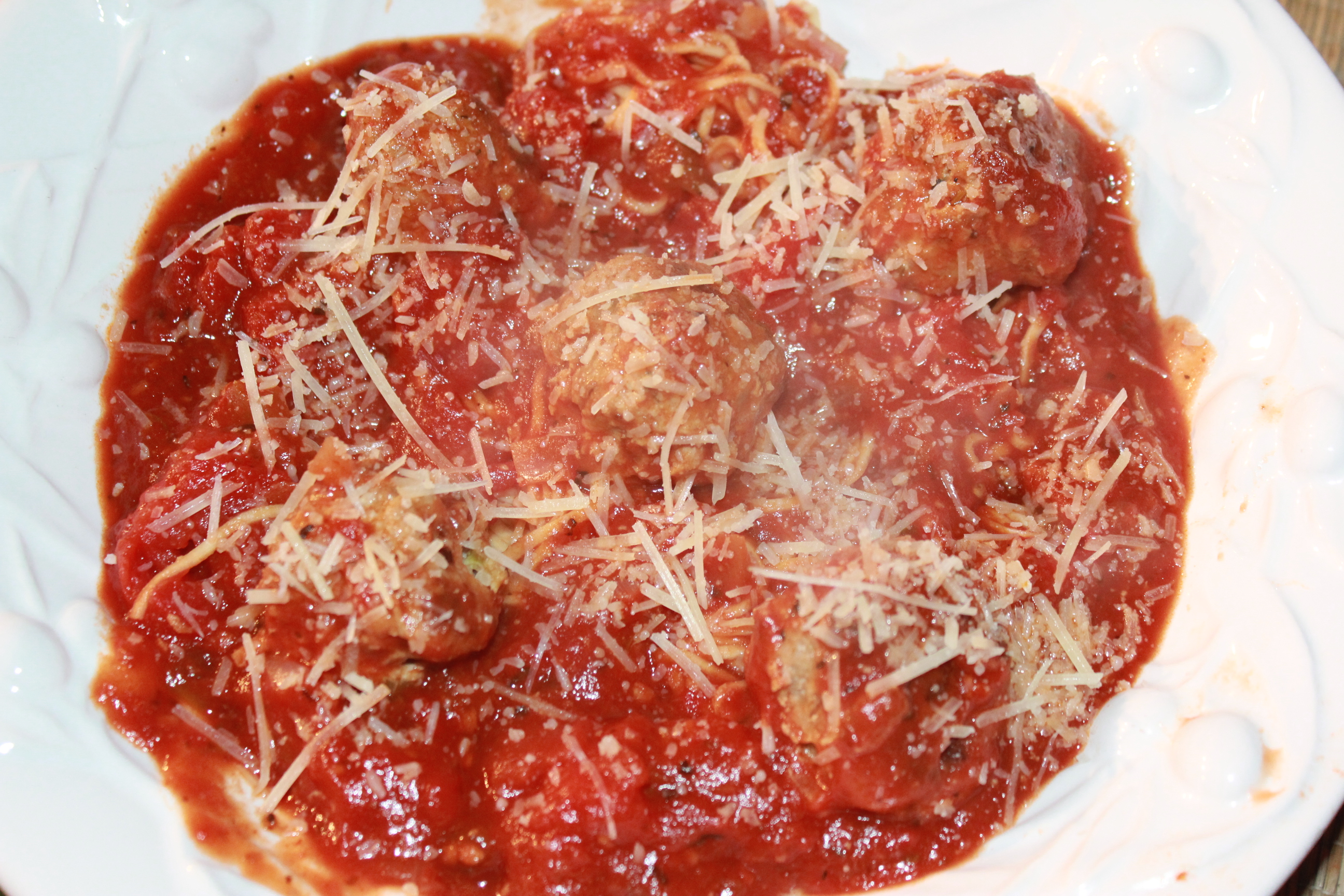 I normally buy ground turkey breast that is at least 99% fat free, but the other day Harris Teeter had 93% lean ground turkey on sale for $3.98 per pound, which was a great deal and saved me a little more than $1.00 per pound. Yaaay! Immediately I thought I’d make turkey burgers for dinner because with the extra little bit of fat they would be juicier. However, for some reason when I got home I asked Brad what he would prefer – turkey burgers or meatballs, and he quickly responded, “Meatballs.”