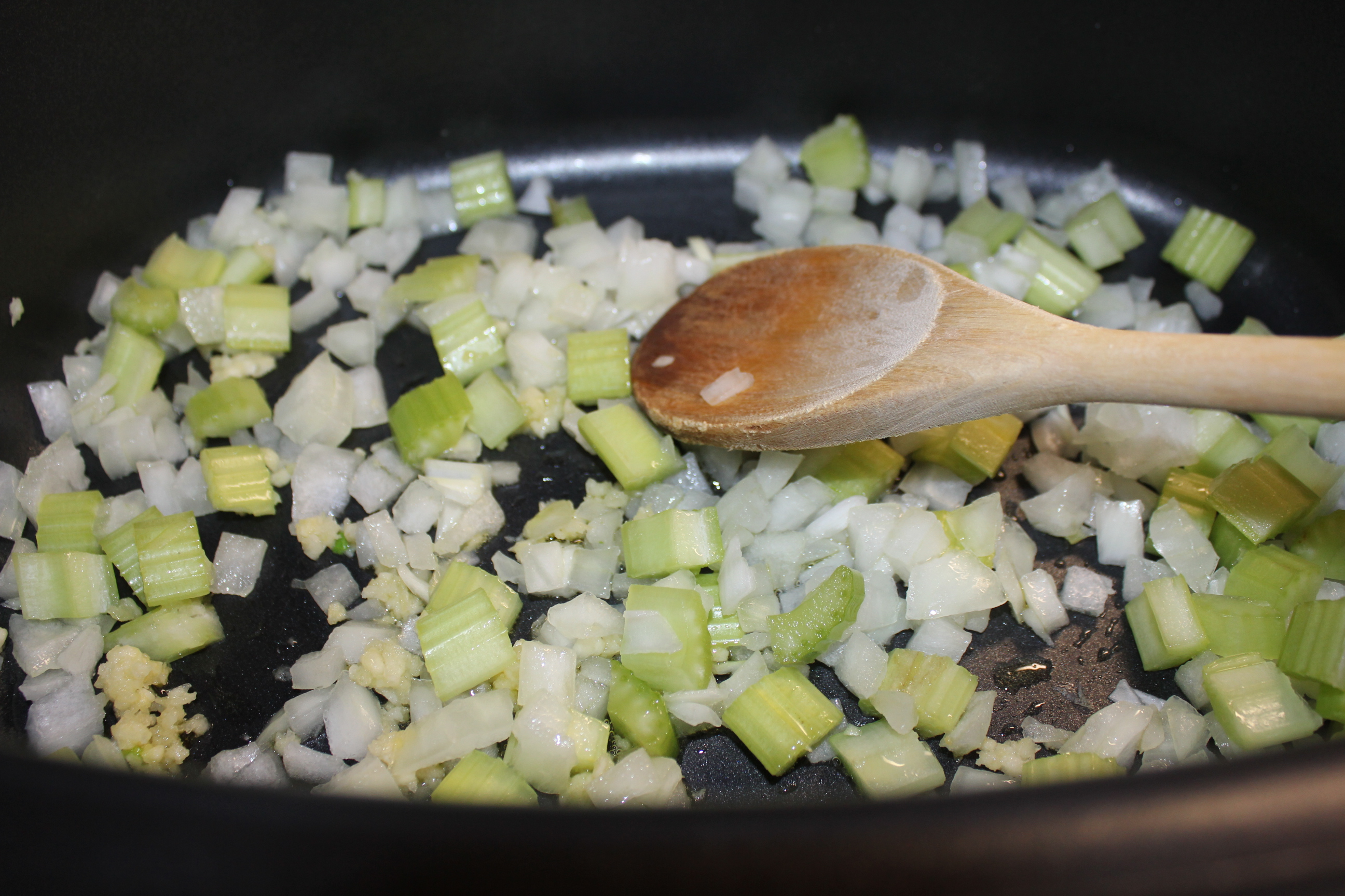 Set your Ninja to Stovetop High. Heat the olive oil and sauté the celery, onion and garlic for 4-5 minutes, until the onion is translucent.
