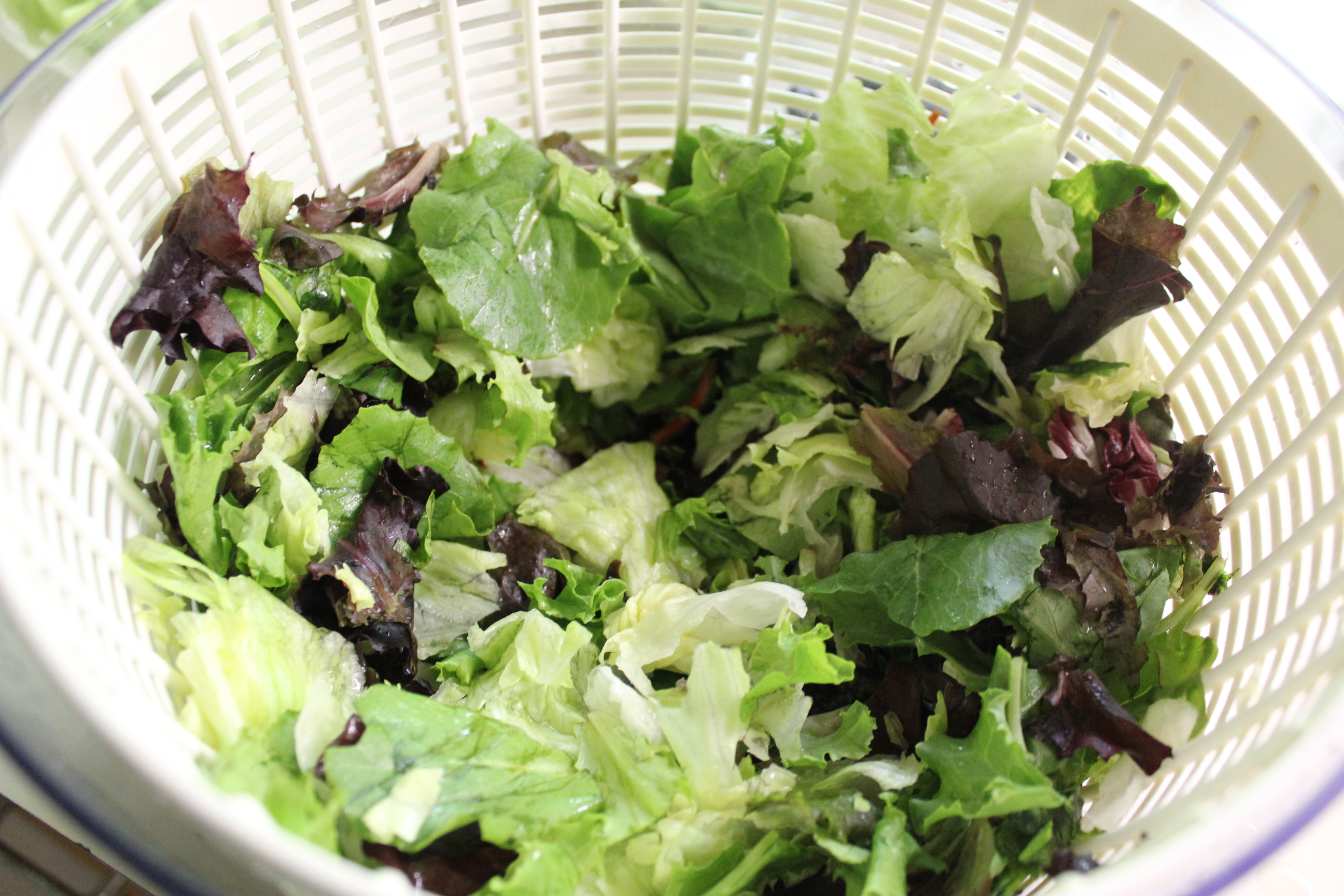 Last in the jar is the lettuce. I tossed some spring mix and iceberg and put it in my salad spinner. Make sure that the lettuce is completely dry before you put it in the jar. I used about 2 ½ cups of lettuce per jar, but that will vary according to how much other ingredients you use.