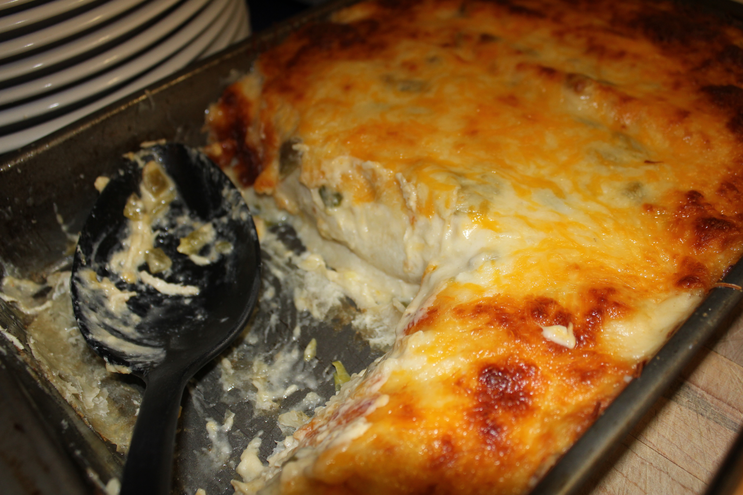 Spread a scant amount of the cheese sauce on the bottom of a 10”x14”casserole dishes, saving most of it to top the enchiladas.