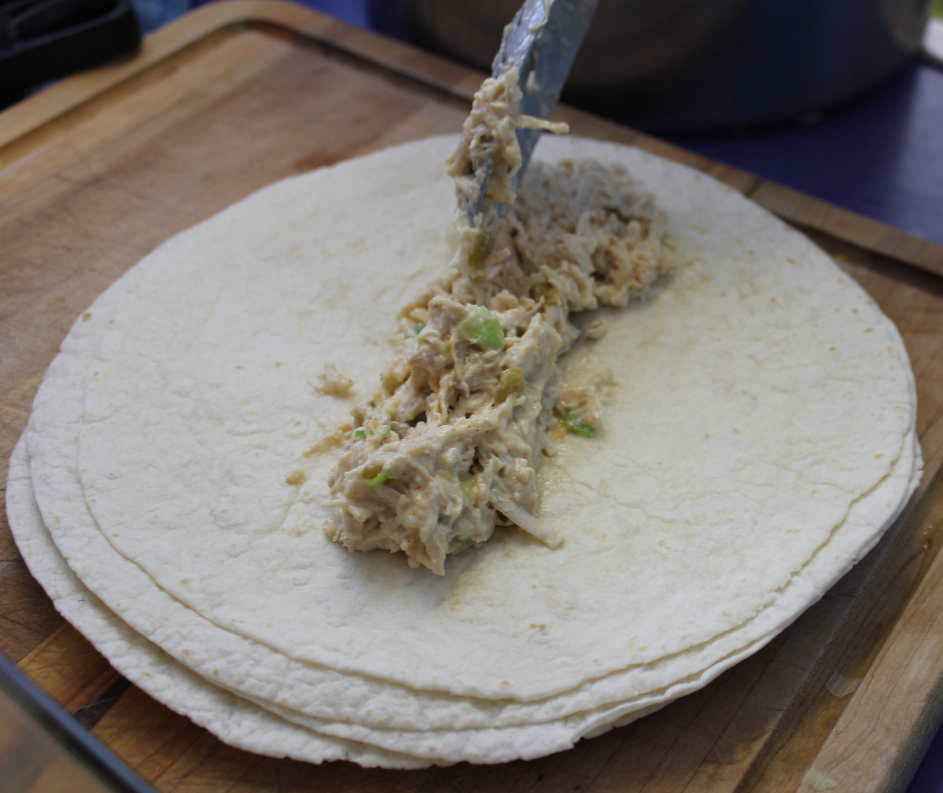 Warm the tortillas according to the package, fill them with the chicken mixture and roll up. Place on top of the cheese mixture.