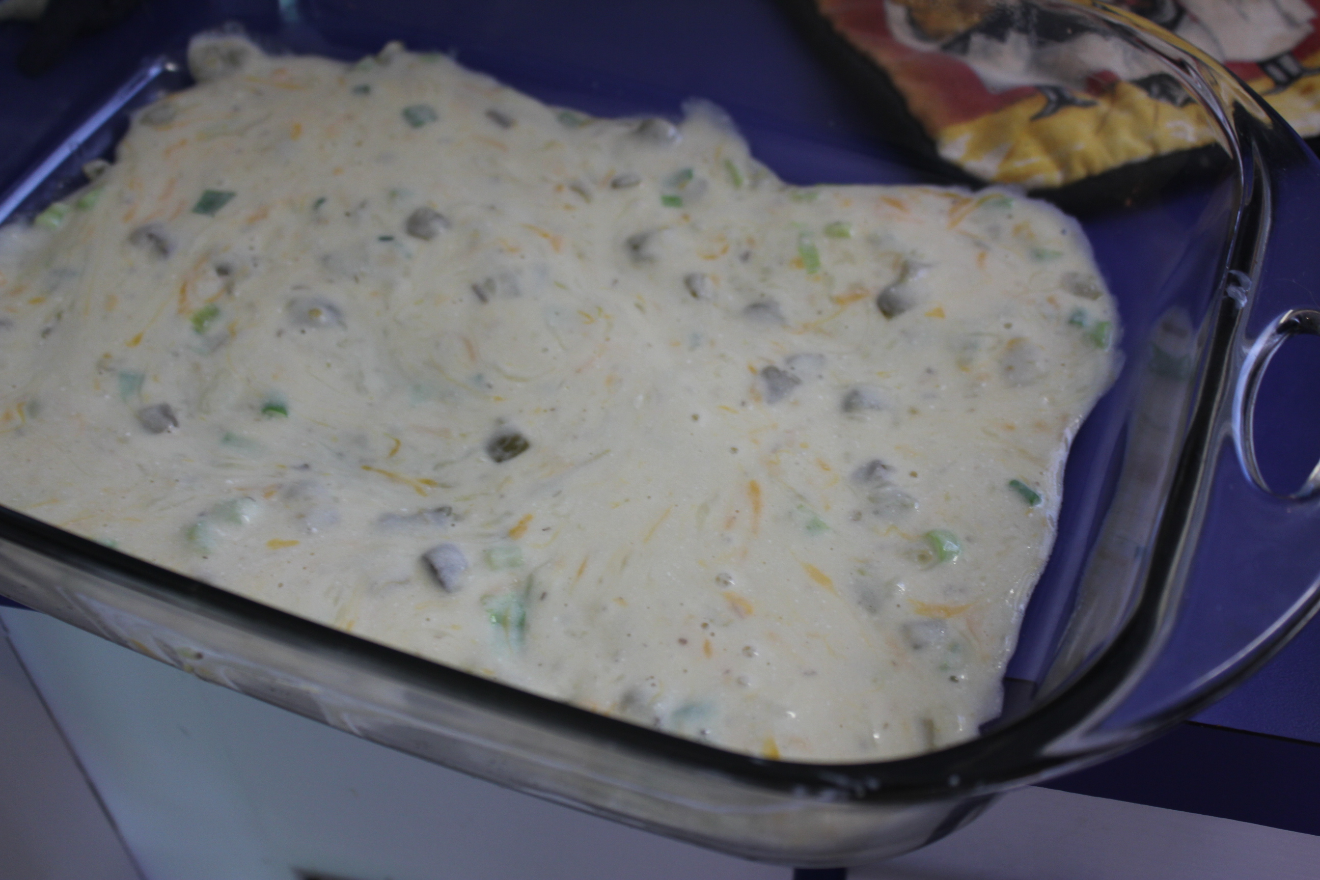 Pour ¾ of the cheese sauce into the chicken mixture and blend well.