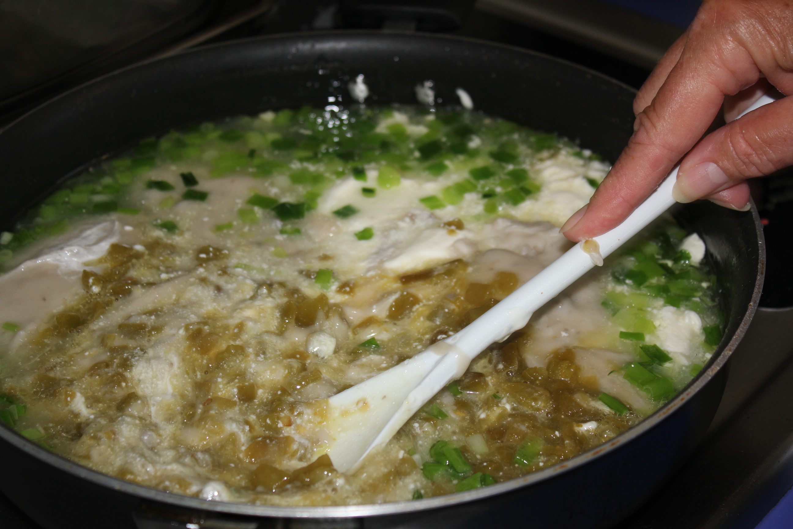 Sauté the green onions in olive oil for 2 to 4 minutes. Add the soup, sour cream, chicken broth, chilies and garlic powder.