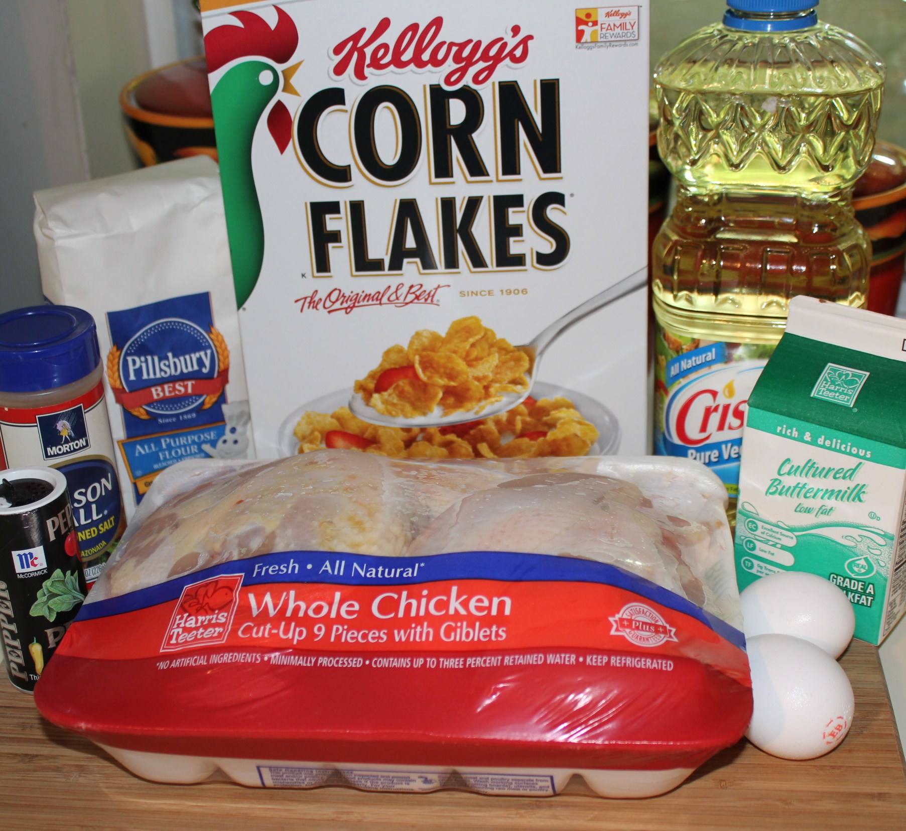 By the time I was in college, I had a recipe that I was quite pleased with. I bought a cast-iron skillet that I used just for frying chicken and still have to this day (I have my Dad’s skillets, too!) Unlike my Dad and Geraldine, I decided to marinate my chicken in buttermilk at least 6-8 hours before frying. Buttermilk is a natural tenderizer and helps to make the chicken nice and juicy. I also added crushed cornflakes to my flour mixture, which gives the chicken extra crunch.