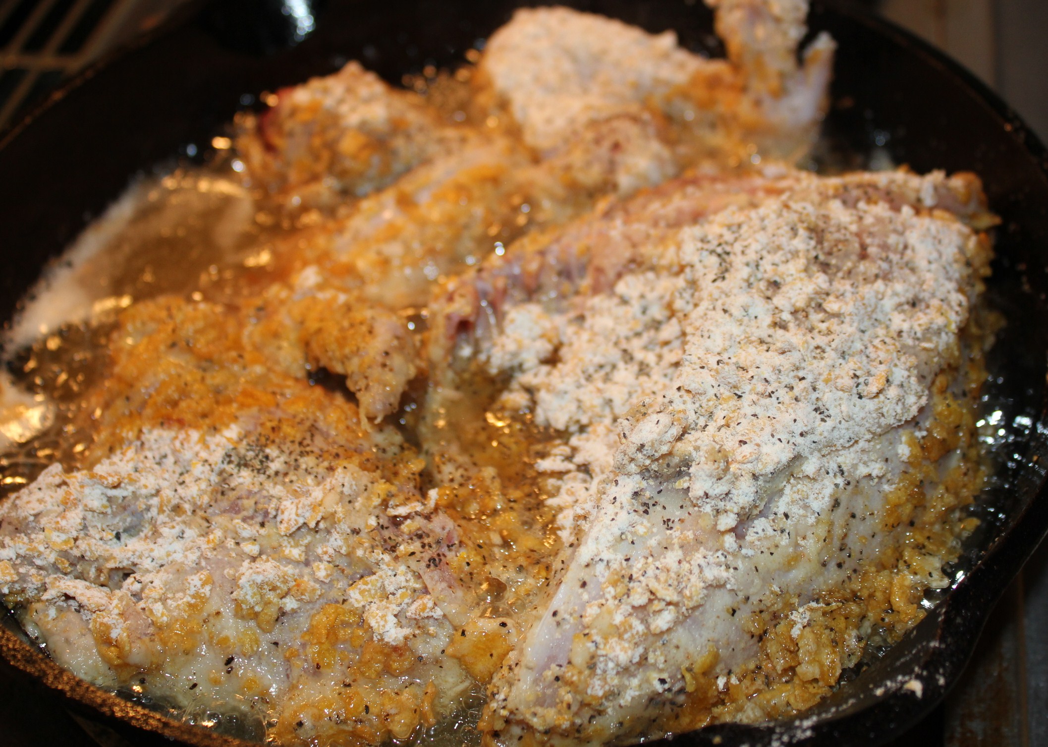 Place the chicken in the cornflake/flour mixture, and coat well. Shake off any excess flour. Place the chicken in the skillet, making sure you do not overcrowd the pan.