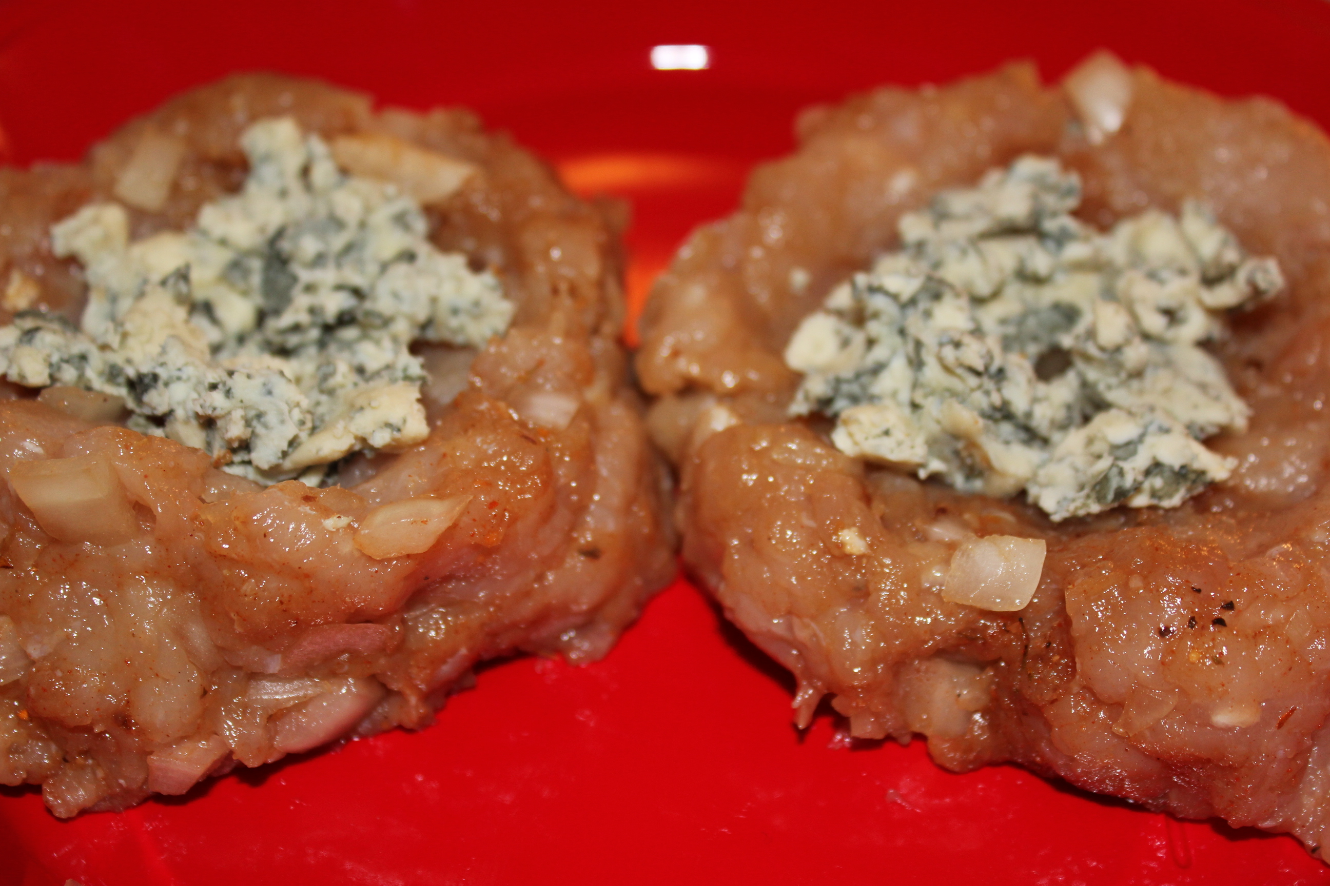 Form into two oblong patties and make a well in the middle of each of them. Add 1/8 cup of bleu cheese crumbles to each burger.