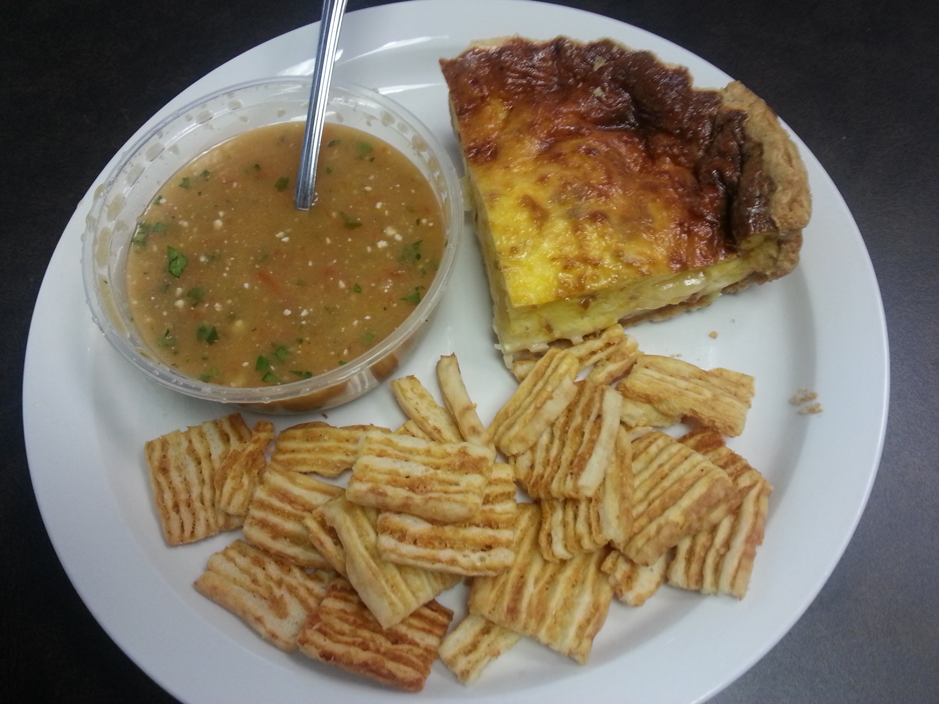 Quiche of the Day with Side Salad ($9.25) I had the Quiche Lorraine, which had a good amount of bacon and Swiss cheese. This quiche was fluffy and had a great consistency, with a nice and flaky crust. You may substitute the side salad with chicken, egg or tuna salad or a cup of soup for $1.00 more. I opted for the soup and had an awesome Chilled Spicy Cucumber Gazpacho, which was garnished with feta cheese. Yum! I wish this was a permanent offering on the menu – it is so tasty! Oh, and it comes with cheese straws that are melt-in-your-mouth awesome.