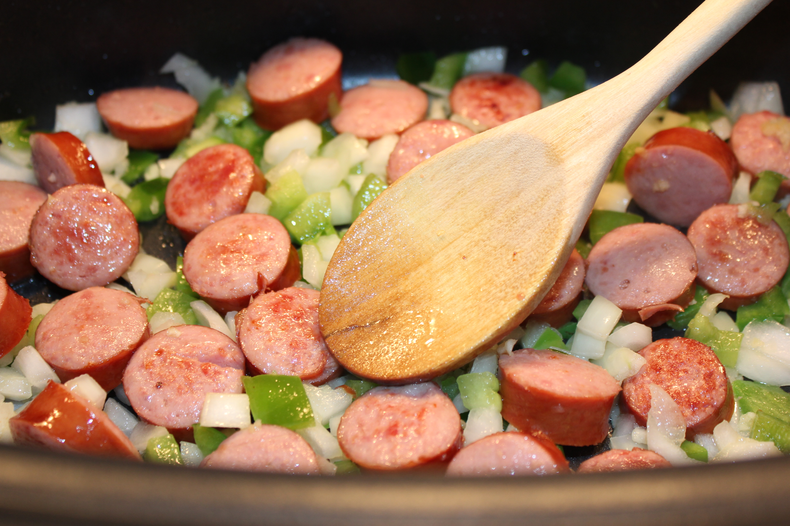 Heat the olive oil in a large skillet (I used my Ninja Cooking System). Add the kielbasa and cook until it is lightly browned on both sides (about 10 minutes or so).