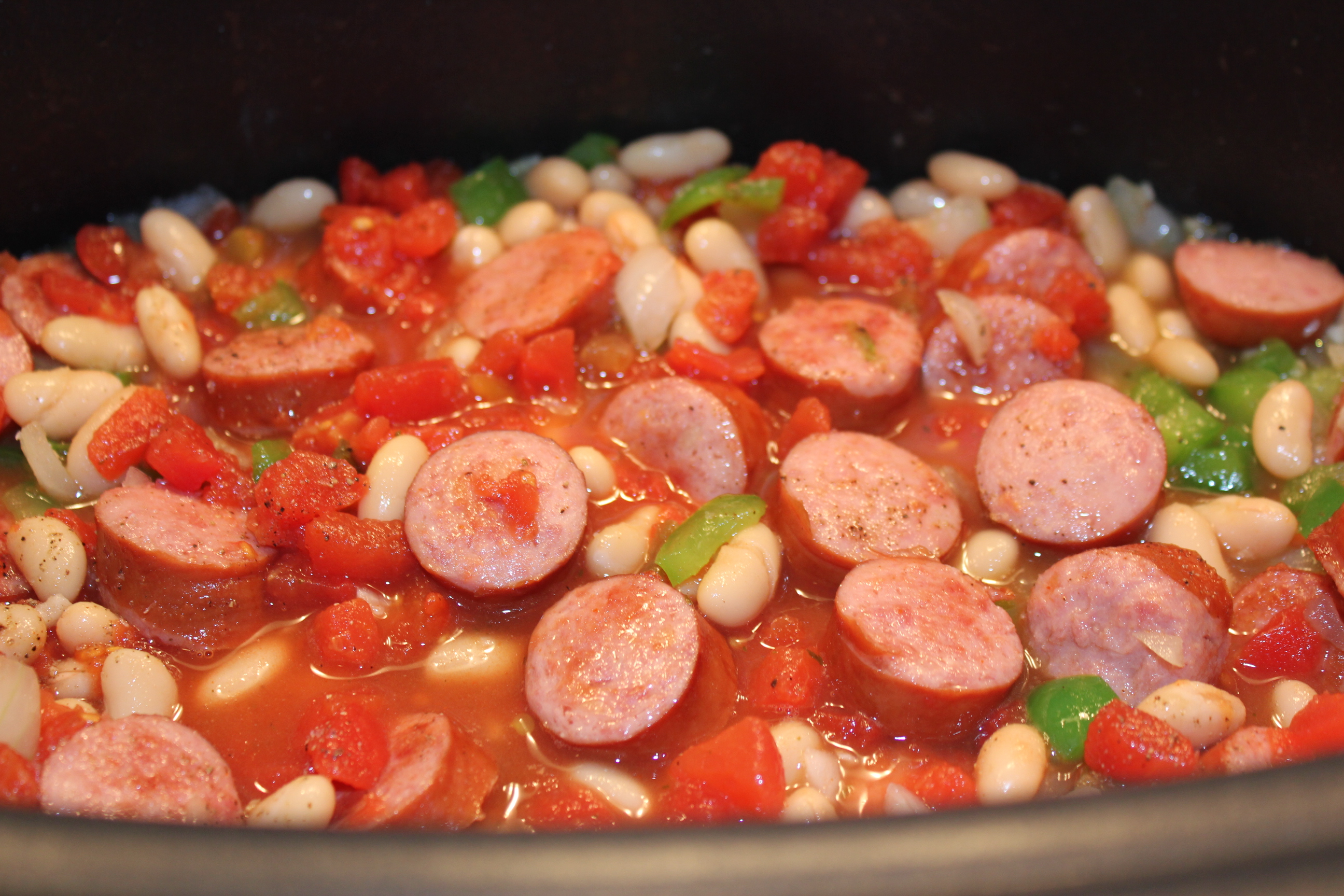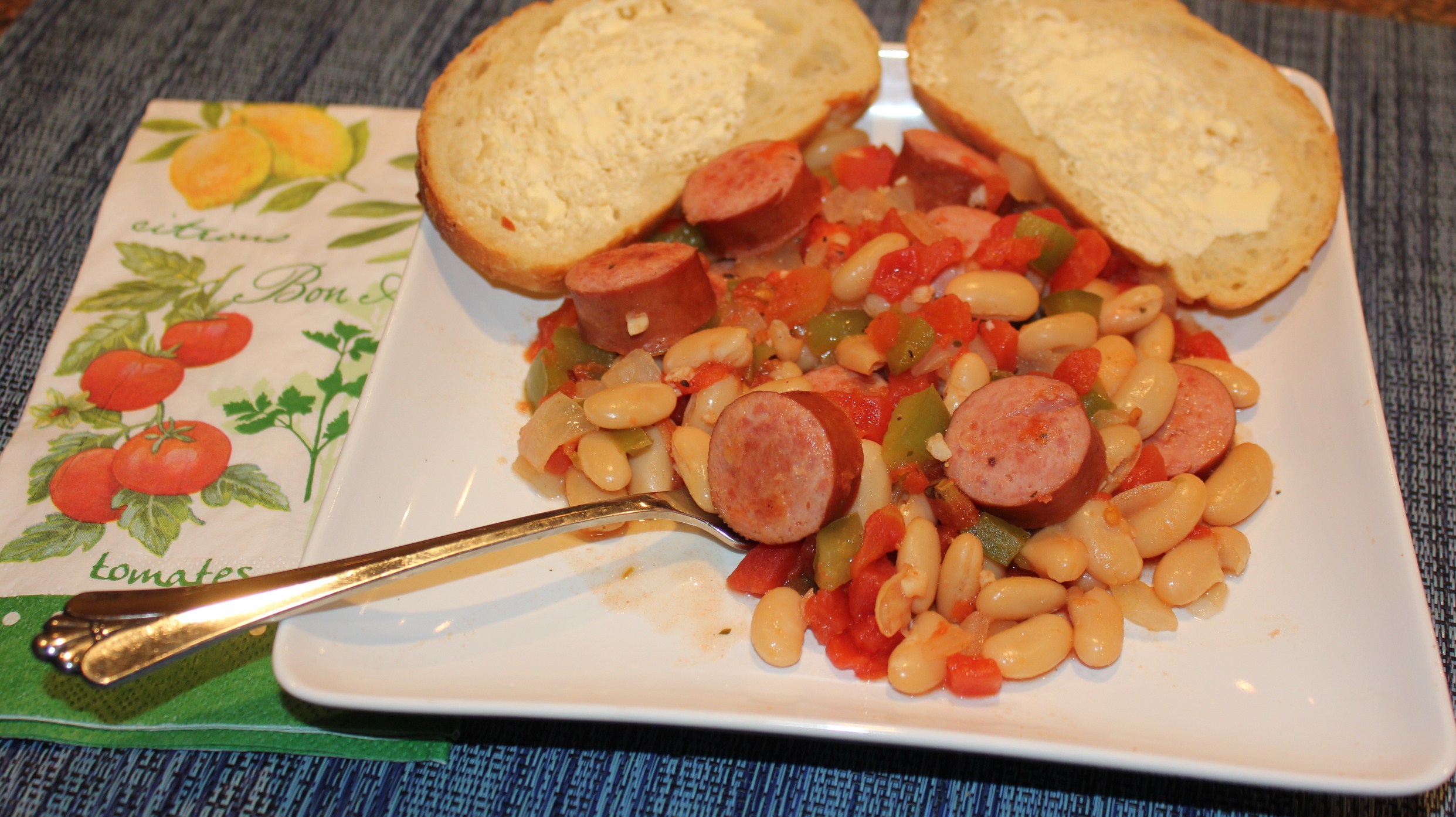 Last week I promised to post a couple of recipes using Red Gold* tomatoes. With the weather getting cooler, here is a hearty and tasty dish with smoky kielbasa, smooth and creamy cannellini beans (which are white kidney beans) and Red Gold petite chili tomatoes that add just enough heat to spice up things a bit. This is such a simple recipe that packs a ton of flavor! While I like to eat this by itself with bread, you could also serve it over pasta or rice by adding an extra can of tomatoes to make it saucier.