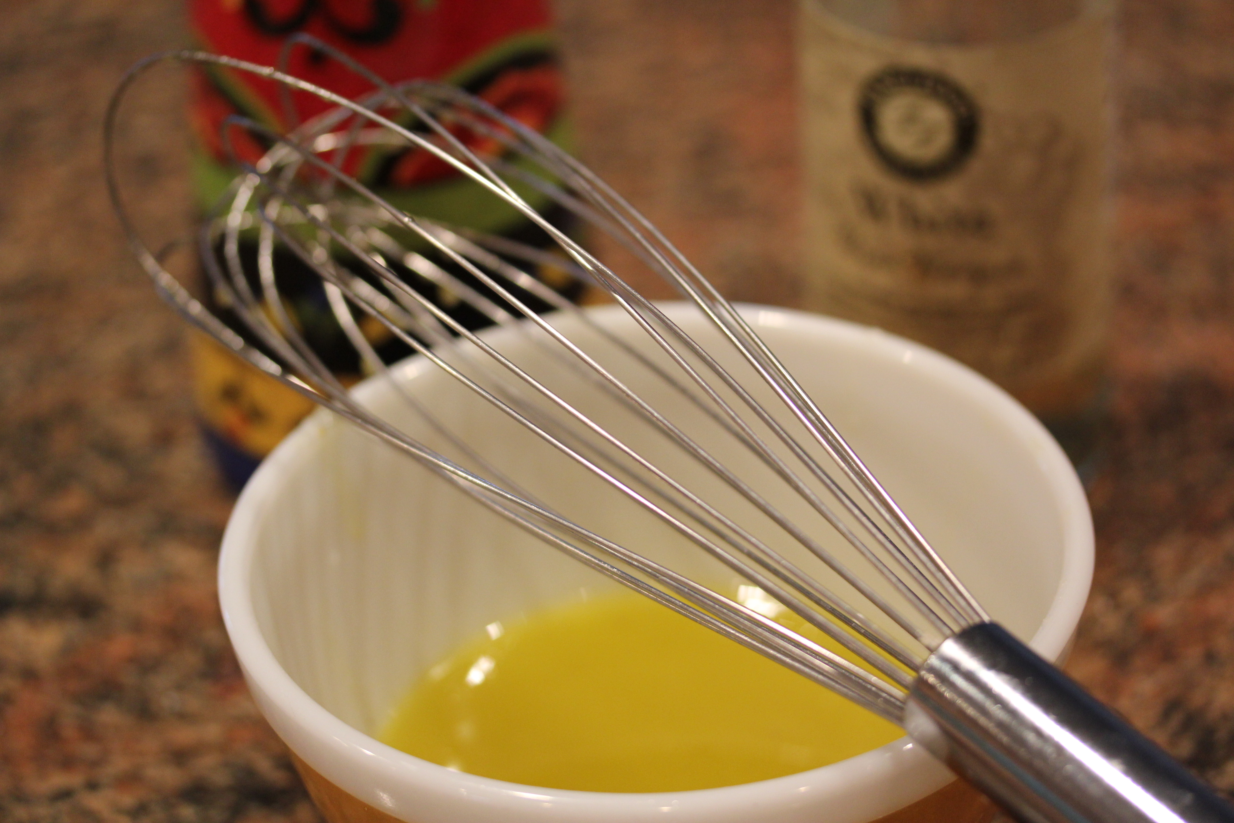 In a separate bowl, whisk together vinegar, olive oil, salt, pepper and sugar.