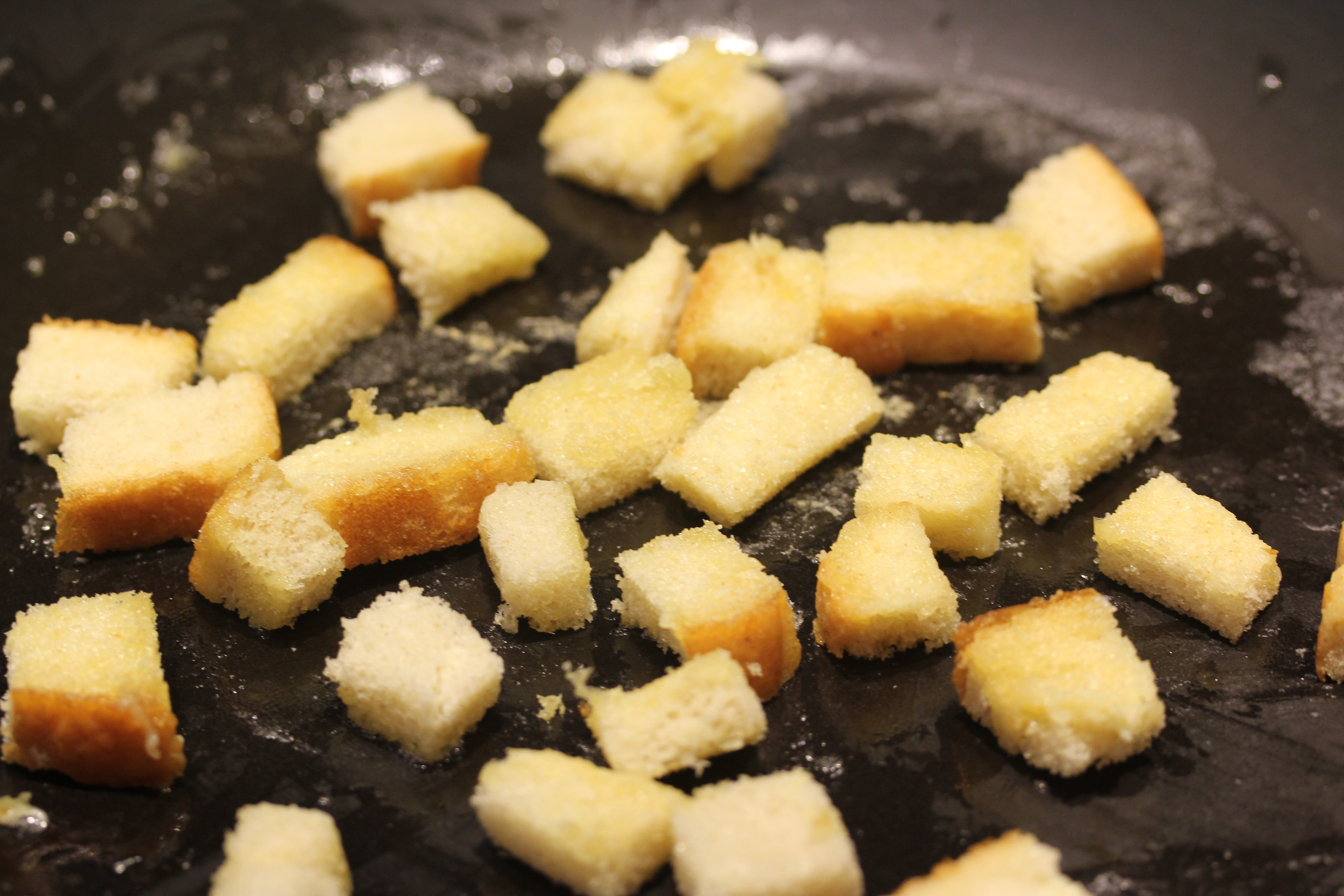 Take a slice of sourdough bread and cut it into bite-sized cubes.