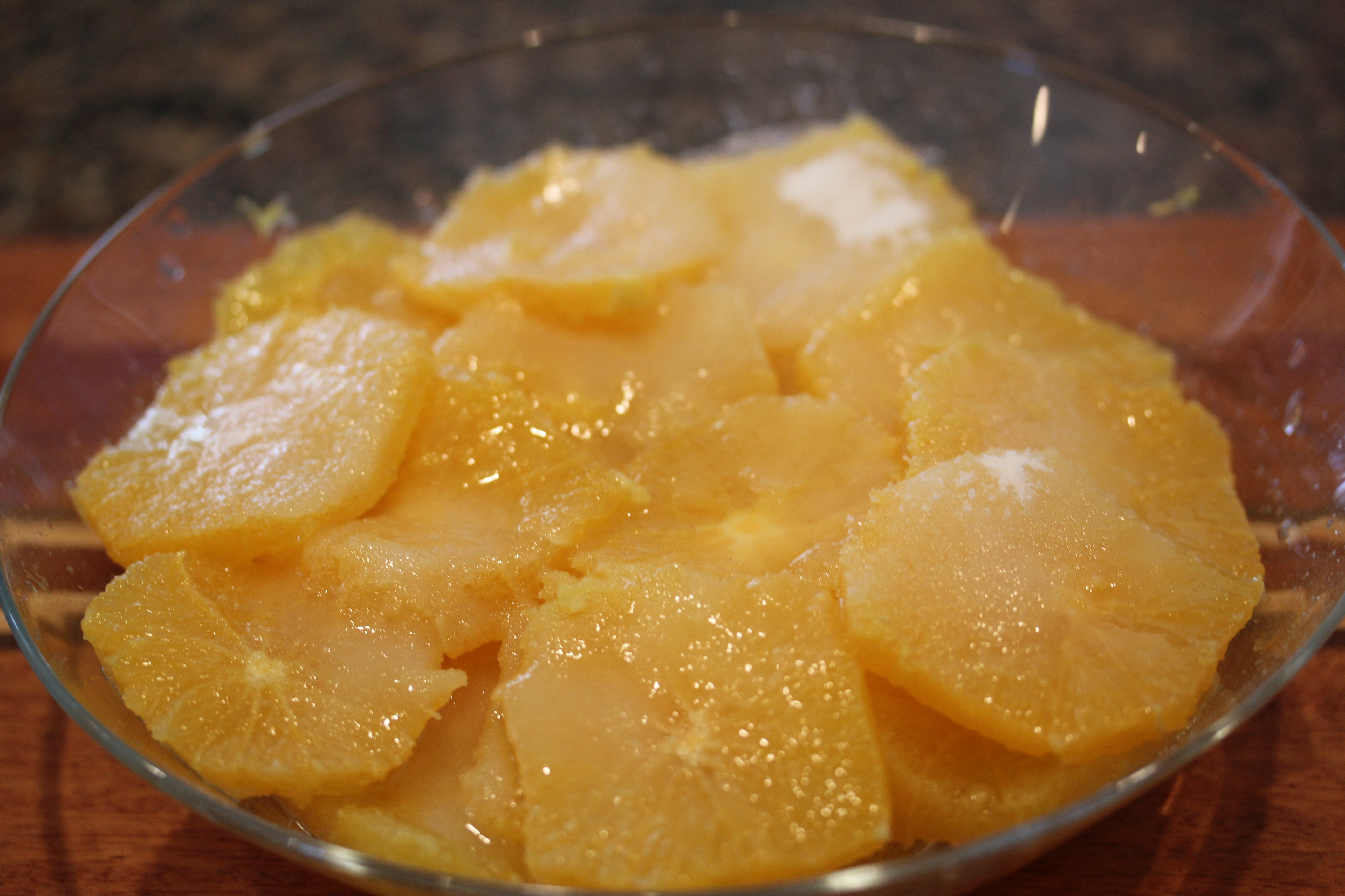 Sprinkle the sugar on the orange slices and gently stir until it is blended.