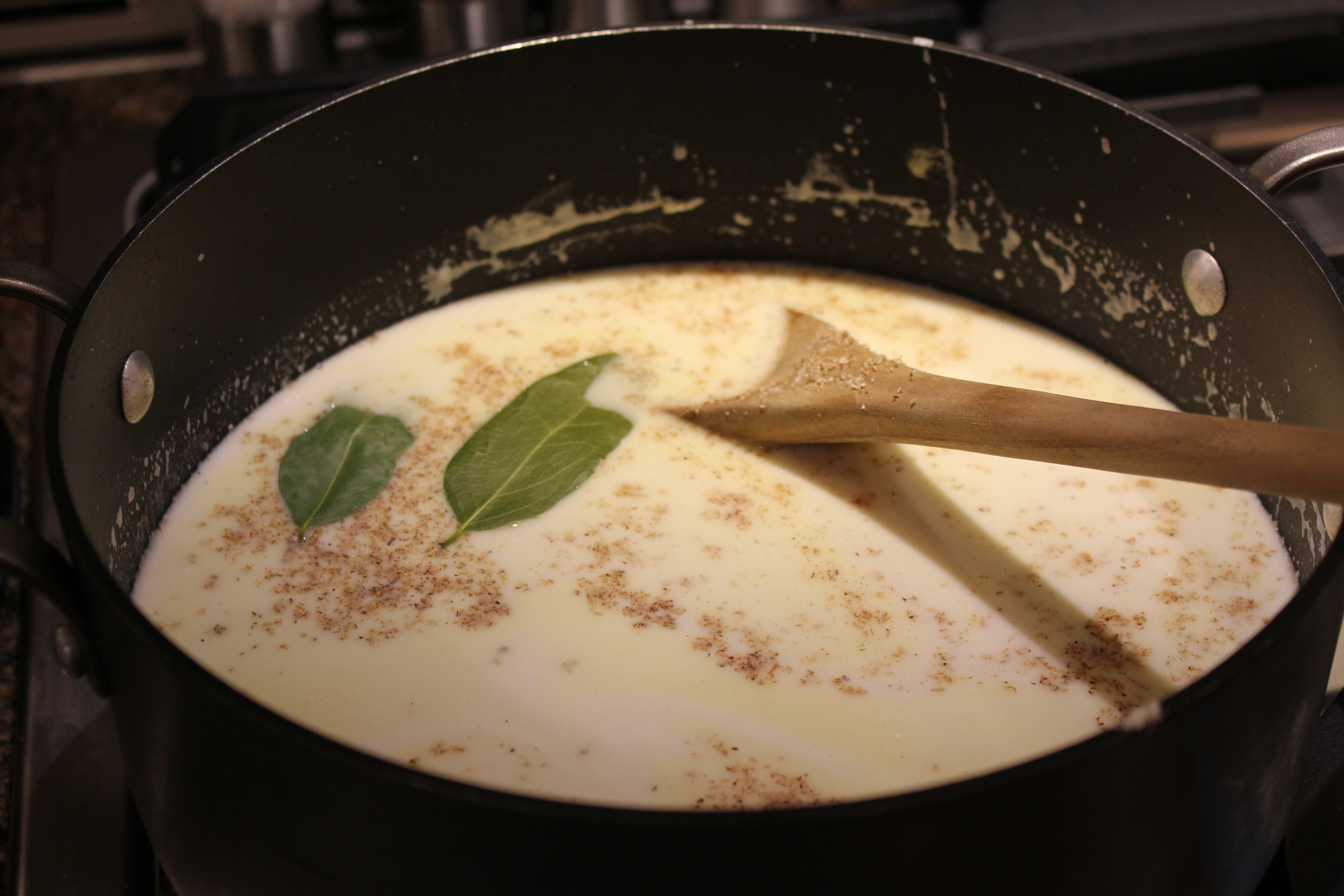 Gradually add the half-and-half until the mixture is smooth. Add the chicken broth, bay leaves, nutmeg, salt and pepper, and cook on medium for 20 minutes or so, until the soup begins to thicken.