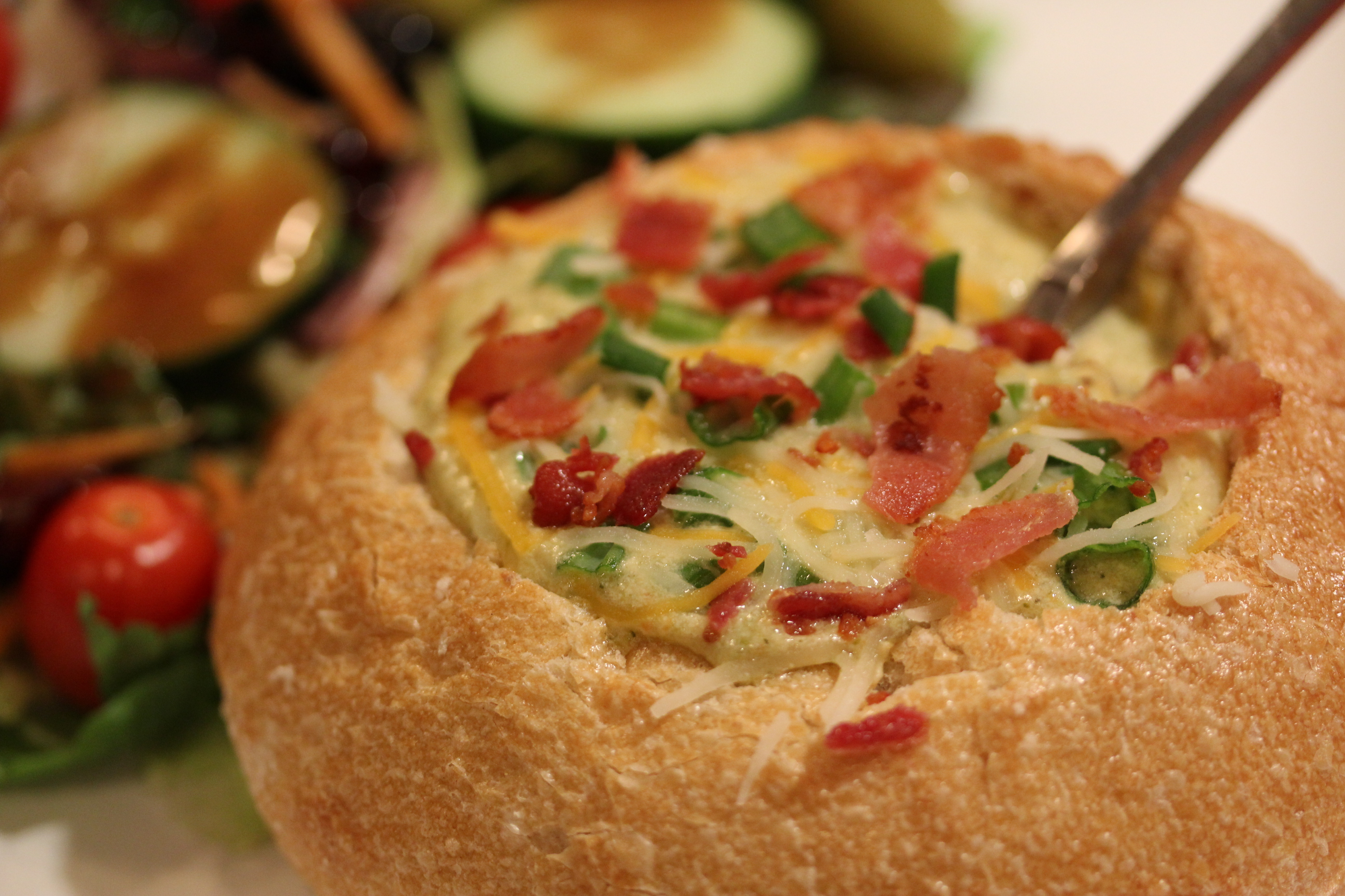 Ladle the soup into the bread bowls. Garnish with a combination of grated cheese, fresh chives, green onions and bacon bits! Serve with a tossed salad.