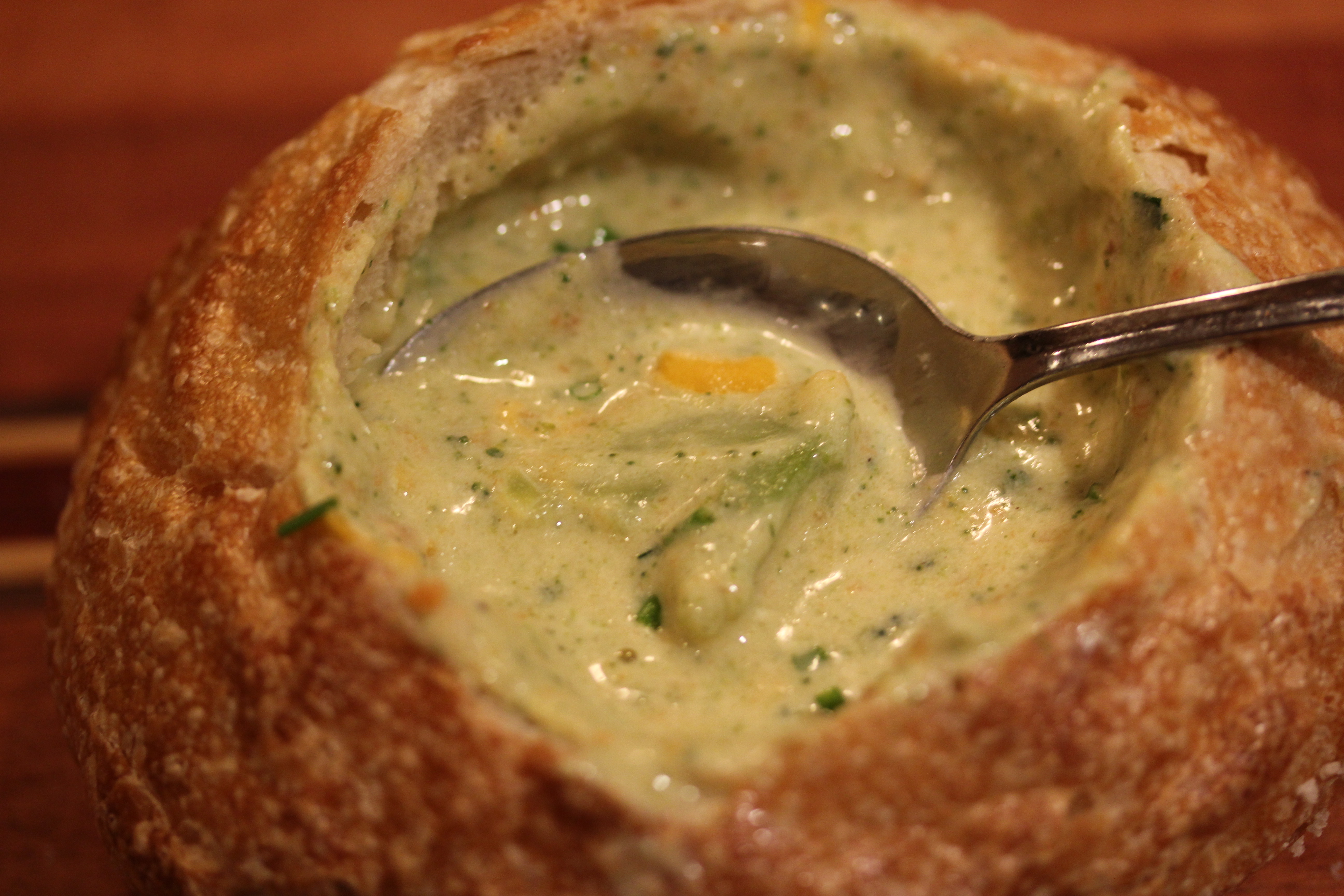 Harris Teeter had small, round sourdough bread loaves on sale the other day, and I immediately thought of using them as bowls for broccoli and cheese soup, much like what Panera Bread serves. After doing a short search on the Internet for a copycat recipe, I decided to make Food Network’s Almost-Famous Broccoli-Cheddar Soup, with just a few changes.